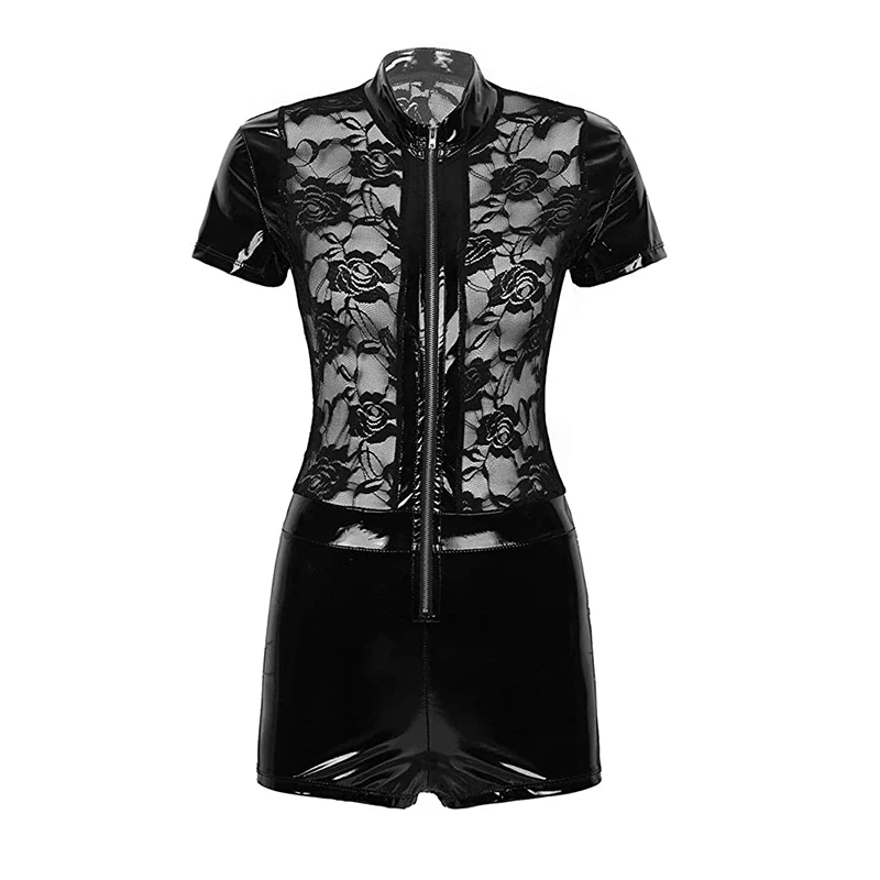 Женский кружевной комбидресс, облегающий комбидресс с мокрым внешним видом и шортами из искусственной кожи, на молнии