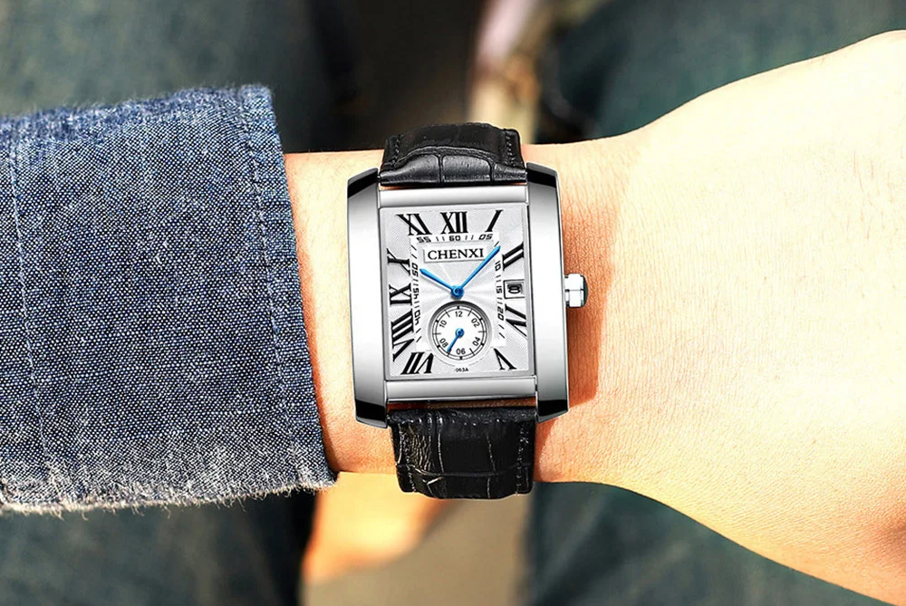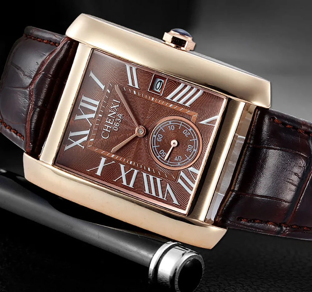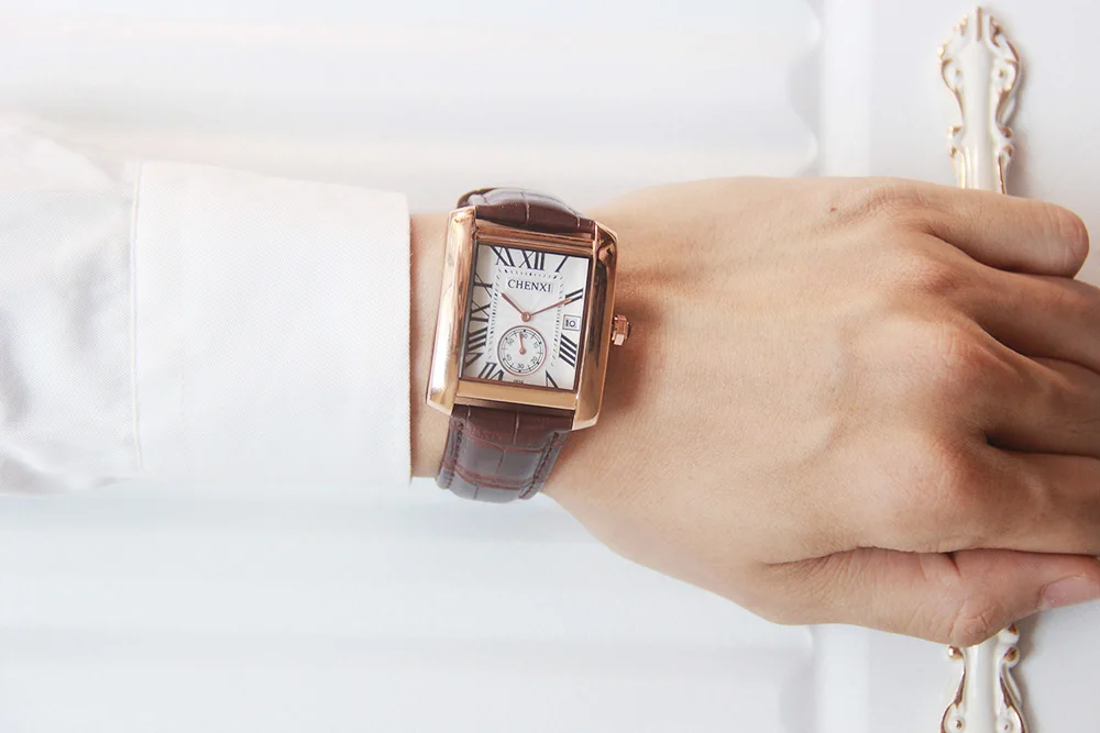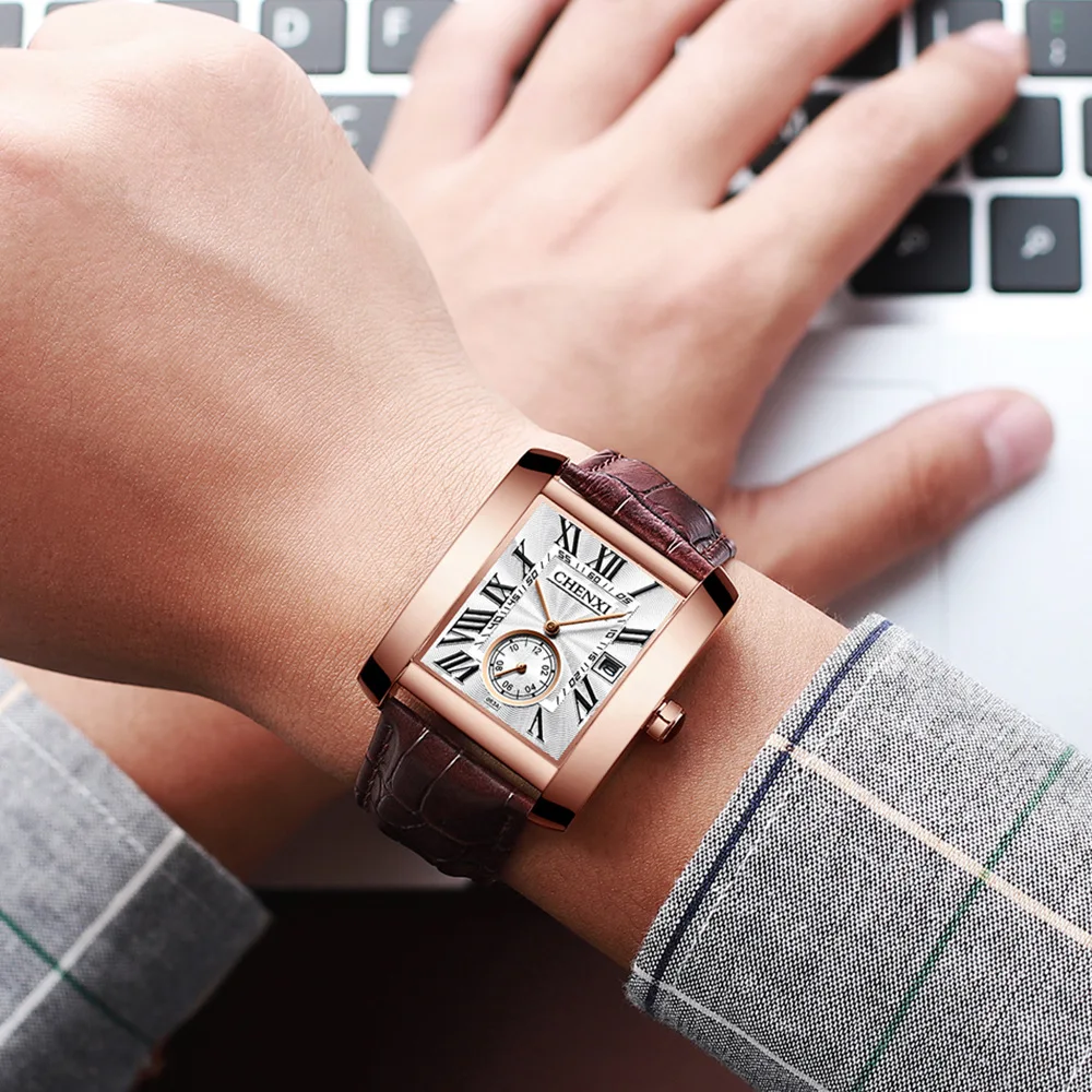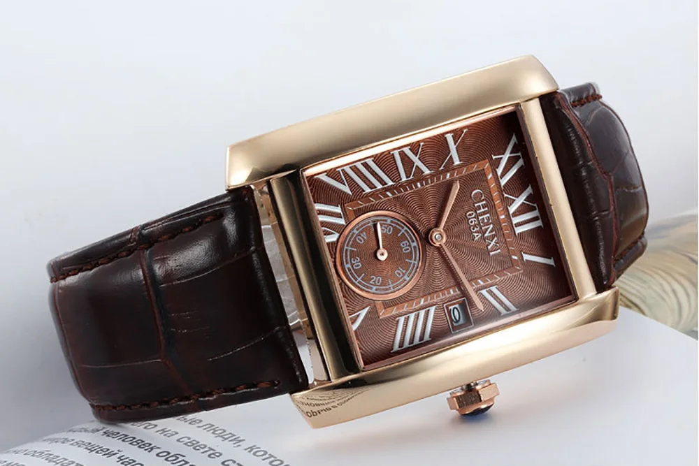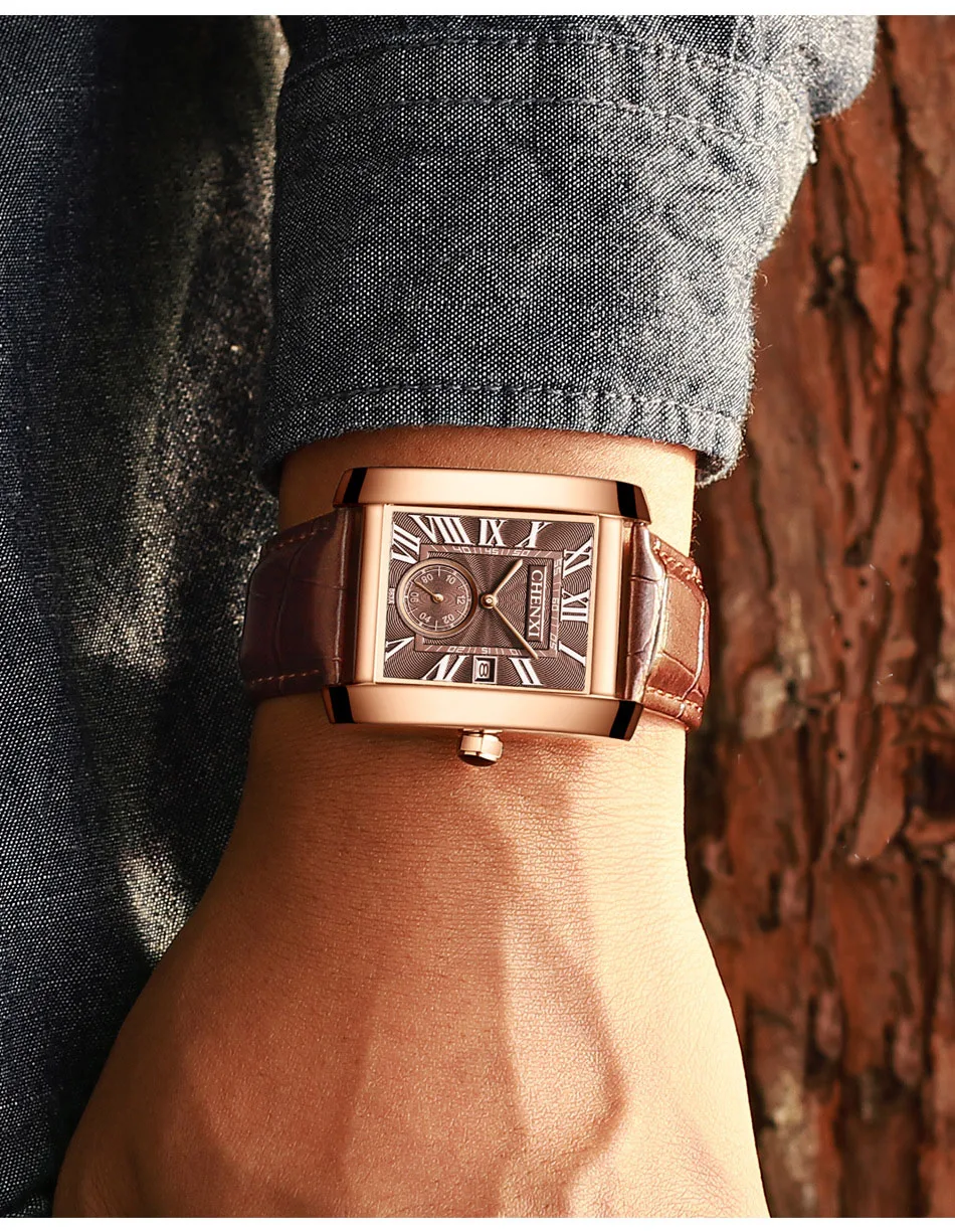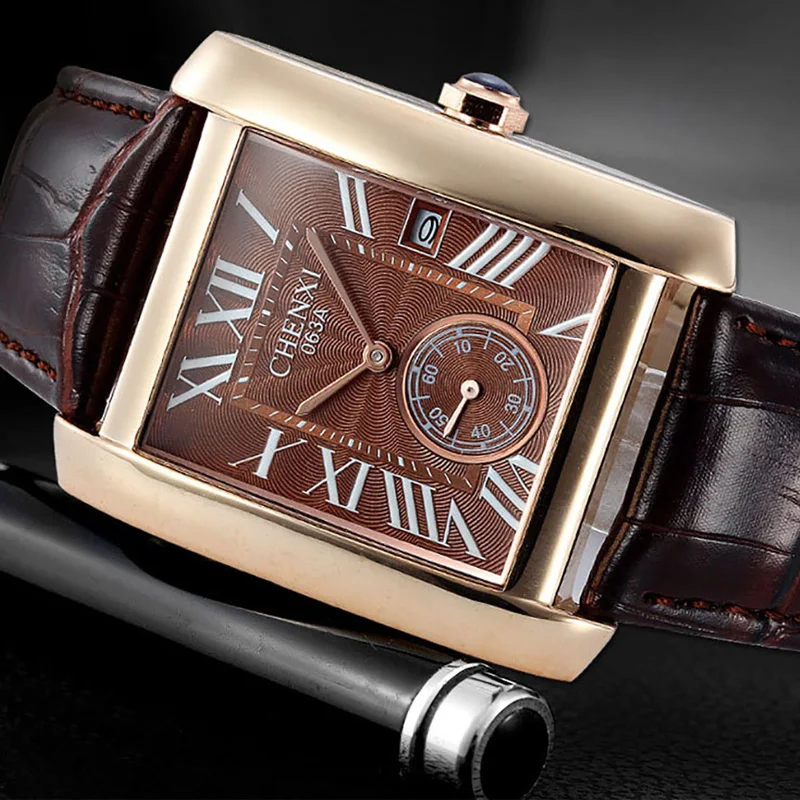 Мужские кварцевые часы с календарём, из натуральной кожи