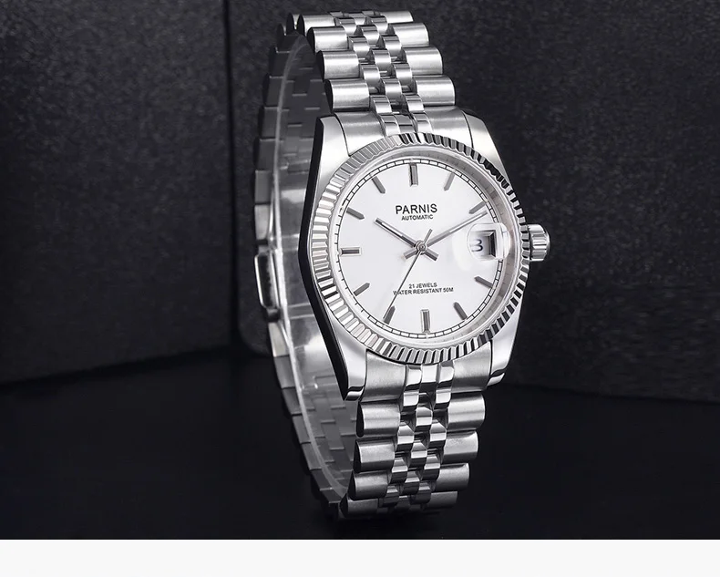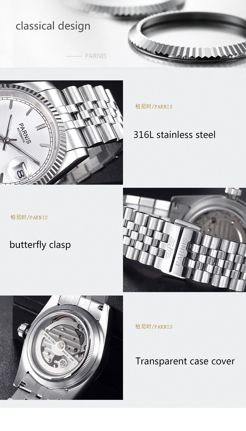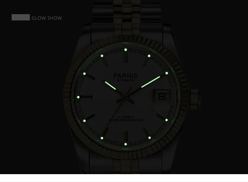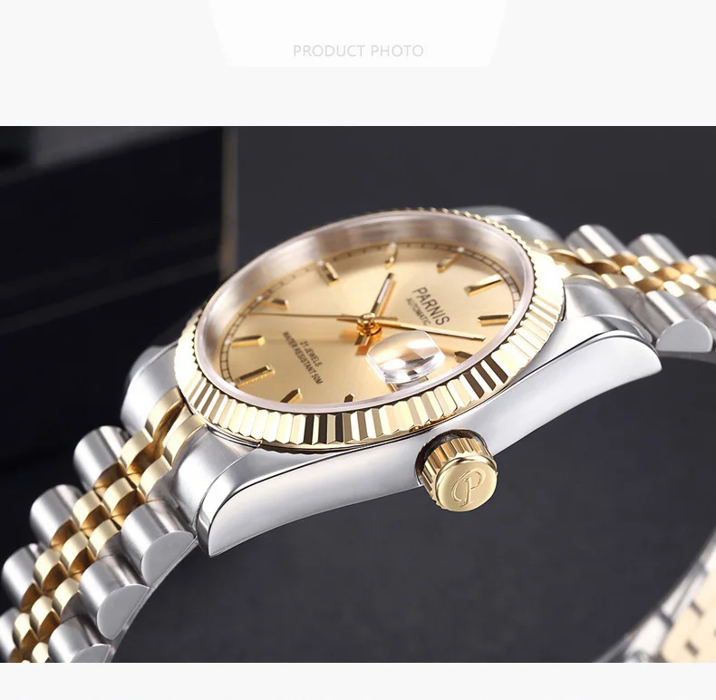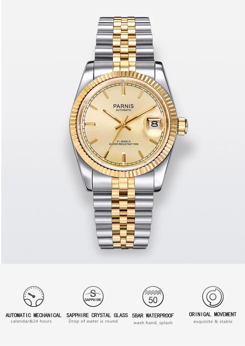 Мужские автоматические часы Parnis, 36 мм, Miyota 821A 6T51, роскошные 5ATM Золотыечерныесеребряные часы, унисекс, сапфировое стекло, дата, Юбилейный браслет