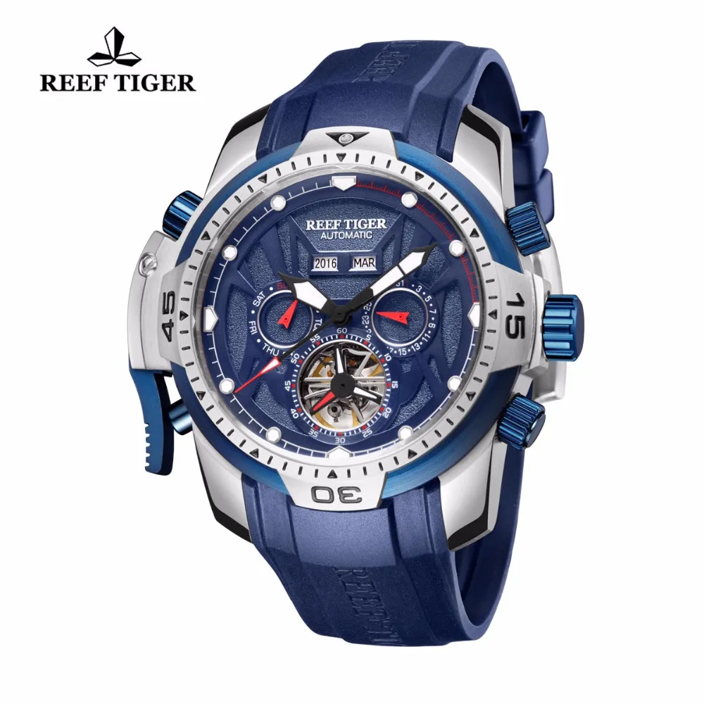 Мужские светящиеся повседневные часы Reef TigerRT с синим циферблатом и вечным календарем, часы с резиновым ремешком RGA3532