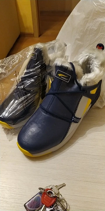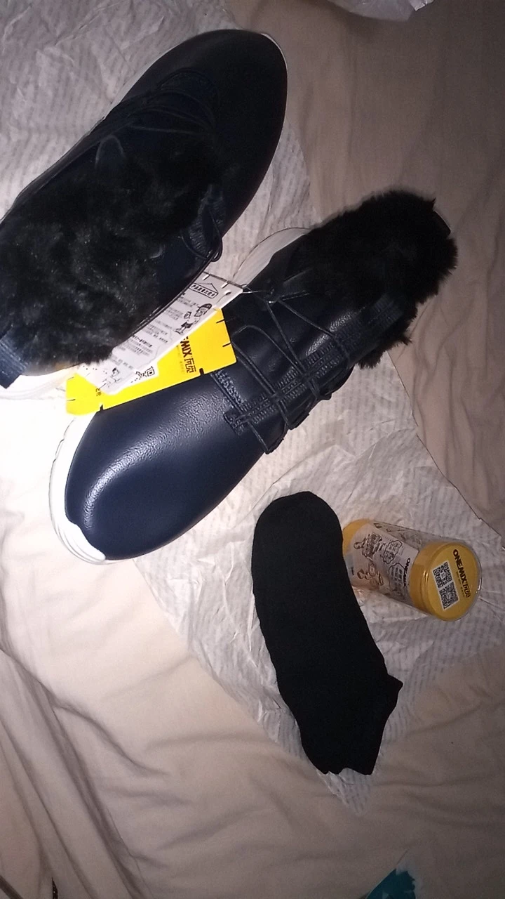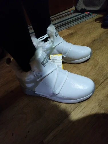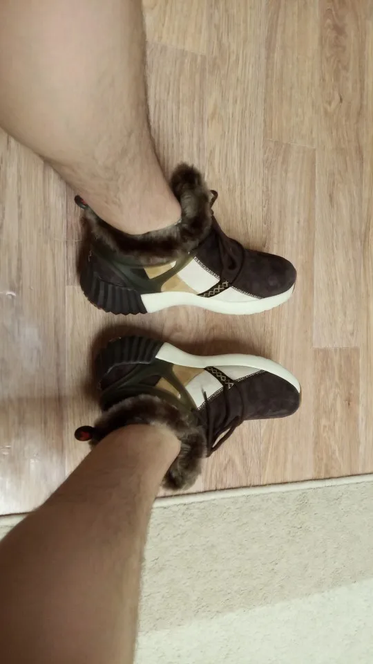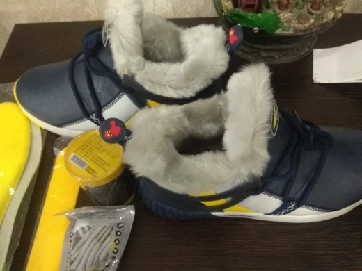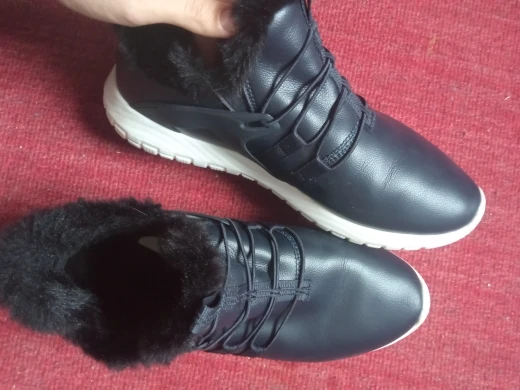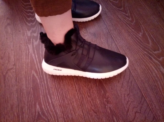 Кроссовки мне достались за 18,68$. Доставка быстрая. В подарок только носки. Как всегда достались мужу. На меня большие. За такие деньги качество нормальное. Естественно кожзам и мех искусственный (но греет тоже хорошо). Шнурки для красоты. Натянул и пошёл. Ходить удобно. У меня нога между 24 и 24,5 см. С размером угадать тяжело. В данном случае 6,5 (24 см) сел хорошо. Даже пару мм запаса есть. Ещё и мех в любом случае уляжется.