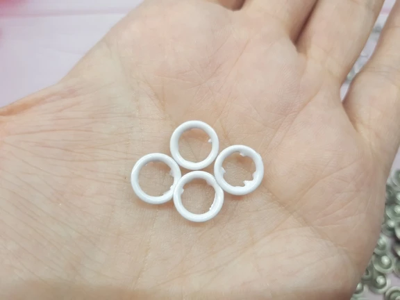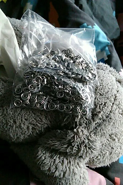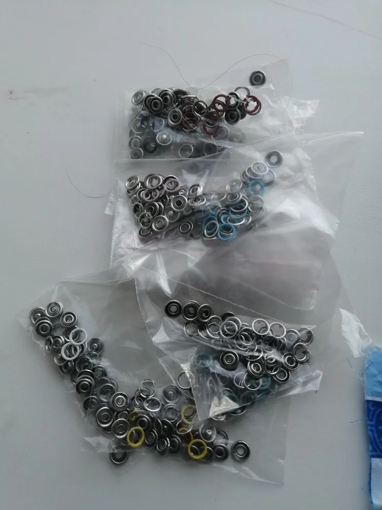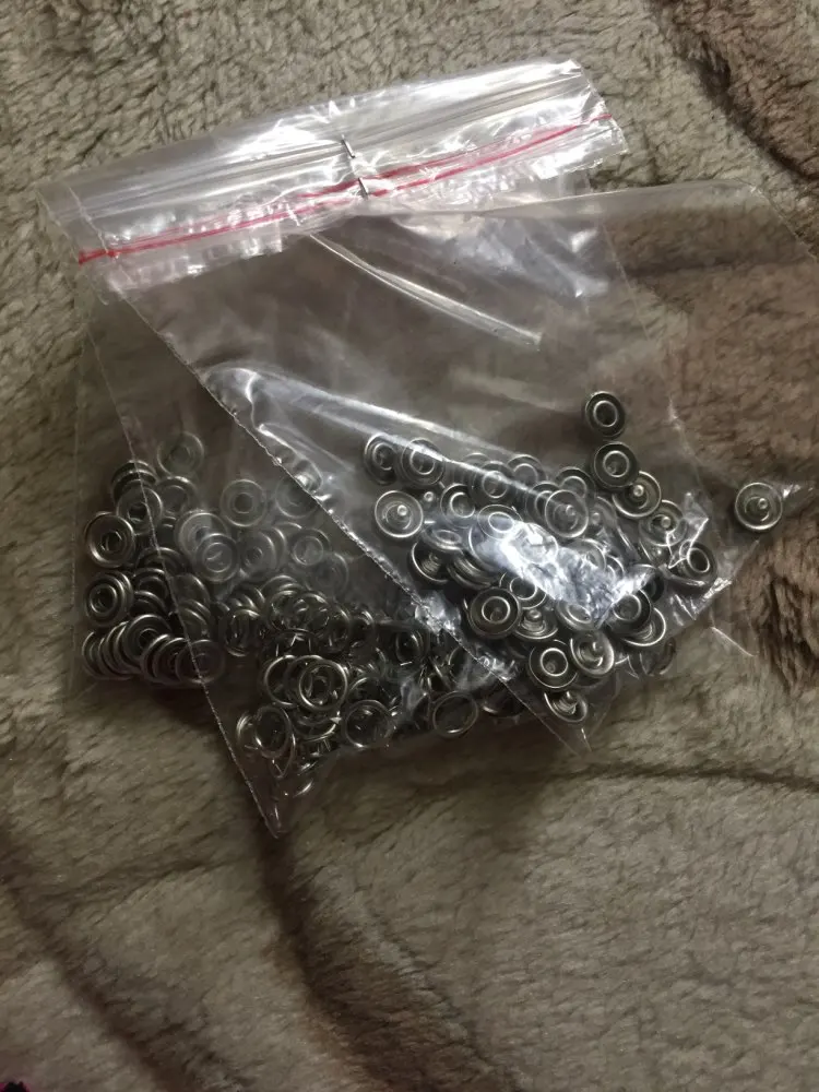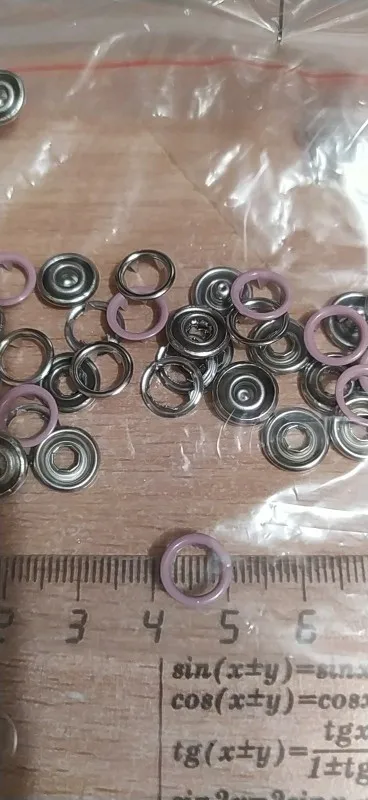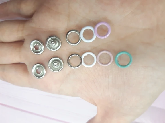 Доставка быстрая, 10-14 дней в объединенном заказе. Цвет соответствует. Заказывала кнопки разных расцветок. По количеству все совпадают и некоторых деталей даже брльше. В этом цвете на 1 цветную деталь от кнопки больше. Но качество не порадовало. Они из очень мягкого и тонкого металла, и качество плохое. Очень тонкие колечки, мятые и кривые детали мама-папа (4 фото). На последнем 5 фото сравнение с кнопками от другого продавца - верхний ряд от другого продавца, а нижний от этого. Даже колечки у этого продавца заметно тонкие, и очень лёгкие вообще кнопки по сравнению с другими. Ставятся на изделие нормально (ручным установщиком). Здесь больше покупать не буду, лучше подороже взять, взаимосвязь цена-качество на лицо.