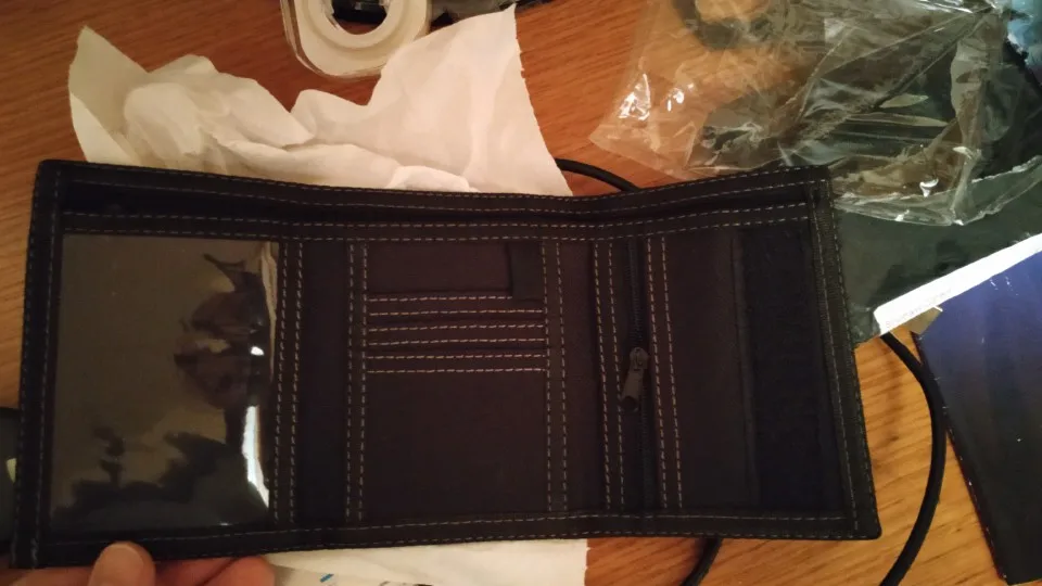 Это довольно хорошо. Внутри есть несколько отделений для карт и прозрачный для удостоверения личности, а также два с молнией, один маленький и другой с емкостью для банкнот. Снаружи есть еще одна застежка-молния для хранения монет. Это не очень большой бумажник.