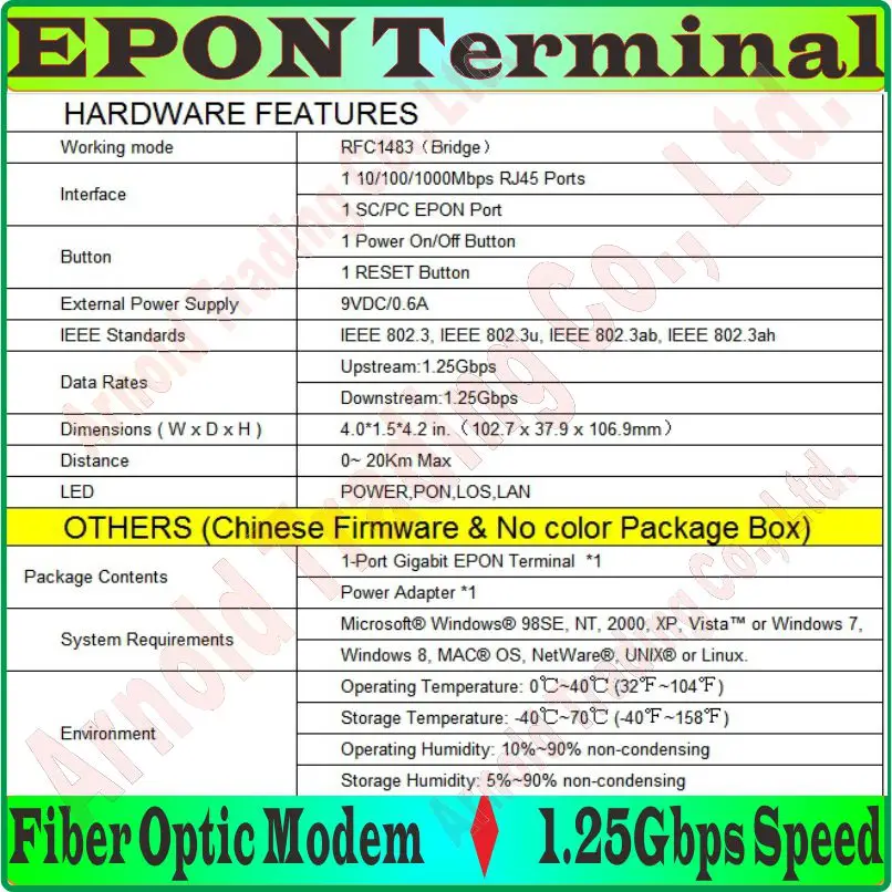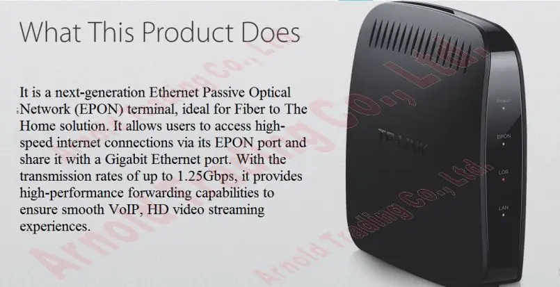 Это пассивный оптический терминал нового поколения Ethernet Nework (EPON), идеально подходящий для волокна к домашнему раствору. Он позволяет клиентам получать доступ к высокоскоростным интернет-соединениям через его порт EPON и поделиться им с гигабитным Ethernet-портом. При скорости передачи данных до 1,25 Гбит/с, он обеспечивает высокую производительность пересылки возможности для обеспечения плавной HD видео straming experineces и так далее.