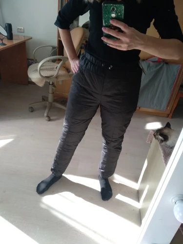 Штаны тёплые, на пуху, на 108см в бёдрах- впритык. Надо было брать больше. Материал с легким блеском. В целом понравились, думаю, будет тепло даже в самые холода