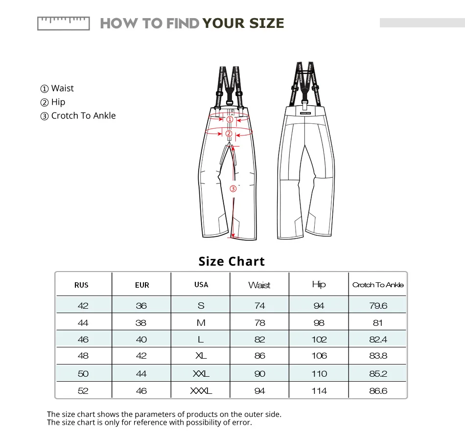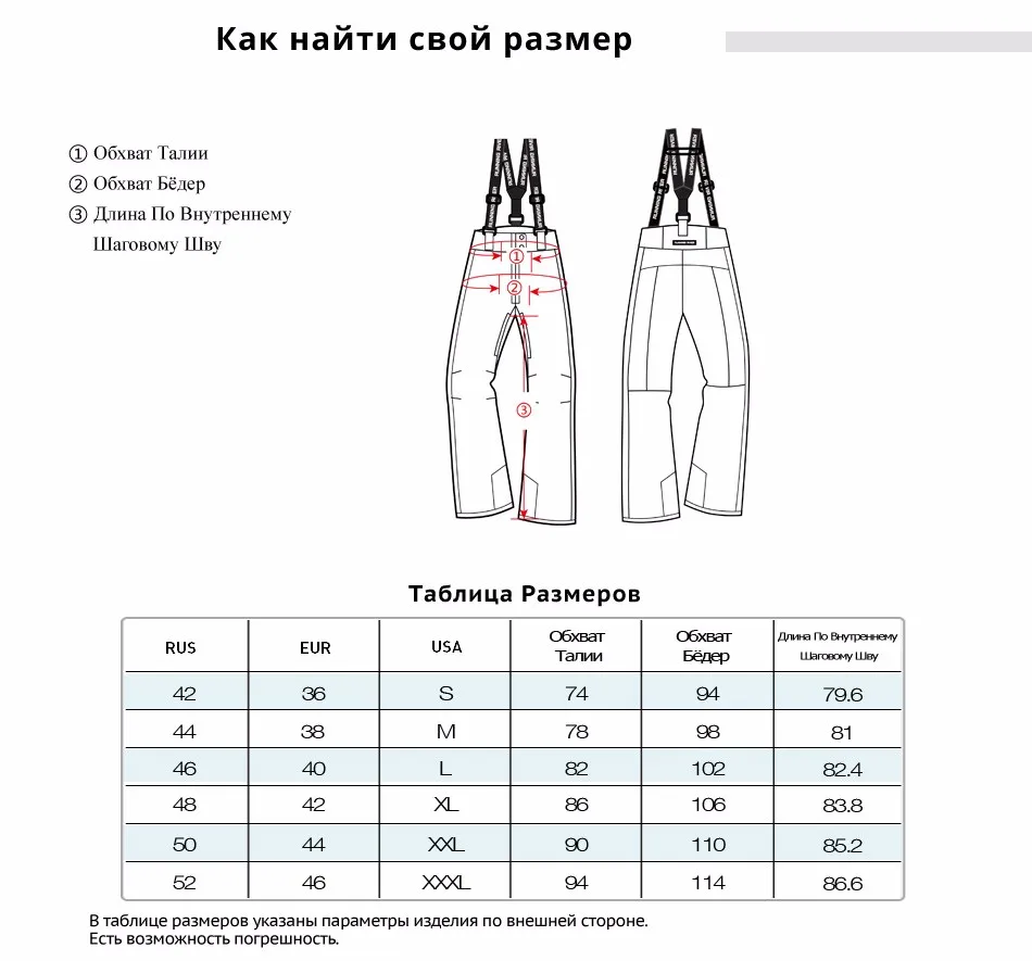 ЗАКАЗ НЕ СООТВЕТСТВУЕТ РАЗМЕРУ ЗАЯВЛЕННОМУ У ПРОДАВЦА.ЗАКАЗАЛА БРЮКИ ПО СОВЕТУ ПРОДАВЦА 2ХХ,НО ПОЛУЧИЛА МЕНЬШЕ,НА РАЗМЕР. ОЧЕНЬ ОЧЕНЬ ТОНКИЕ БРЮКИ, "ГЕТРЫ" ИЗ ШЕЛЕСТЯЩЕГО СКОЛЬЗКОГО МАТЕРИАЛА,РЕЗИНКА ВНИЗУ РАСТЯНУТА,ЗАЩИТЫ ОТ СНЕГА НЕТ.ЭТО НЕ ГОРНОЛЫЖНЫЕ БРЮКИ.ПОЛУЧИЛА БРЮКИ ОТ 85 СМ, ОБ 105 СМ. ЗАЯВЛЕНО ОТ 90 СМ, ОБ 110 СМ. НА МЕНЯ МАЛОВАТЫ , МОИ РАЗМЕРЫ..ОТ 95, ОБ 106,НЕ ХВАТАЕТ ТЕХ ЗАЯАЛЕННЫХ САНТИМЕТРОВ ДЛЯ ЗАЯВЛЕННОГО РАЗМЕРА. СМОТРИТСЯ КРАСИВО,НО ЭТО И ВСЁ....... ДЛИНА НА РОСТ 166 ОЧЕНЬ ДЛИННАЯ. ПОШИВ ХОРОШИЙ,НО ЭТОТ ТОВАР НЕ СТОИТ ЭТИХ ДЕНЕГ. ПО СПОРАМ ПОЛУЧИЛА ЧАСТИЧНО ВОЗВРАТ НА КУРТКУ И БРЮКИ ПО РЕШЕНИЮ КОМАНДЫ AliExspress, ПРОДАВЕЦ ЗАЯВИЛ О ВОЗВРАТЕ ТОВАРА.МАТЕРИАЛ ГОЛЬНАЯ СИНТЕТИКА 100% ,К ТЁМНЫМ ВСТАВКАМ НА КУРТКЕ СРАЗУ НАЛИПЛИ ДАЖЕ ПЫЛИНКИ.НИКОГДА БЫ НЕ КУПИЛА,ЕСЛИ Б ВИДЕЛА. В МОИХ КОСТЮМАХ,ПОДКЛАДА ИМЕЕТ СЕТКУ,,А ЗДЕСЬ ДЕШЁВАЯ СИНТЕТИКА.. НЕ РЕКОМЕНДУЮ,ПОЛНОЕ НЕ СООТВЕТСТВИЕ КАЧЕСТВА МАТЕРИАЛА,РАЗМЕРА, И НИ КАК ЭТО НЕ ГОРНОЛЫЖНЫЕ ВЕЩИ. РЕШАТЬ ВАМ.
