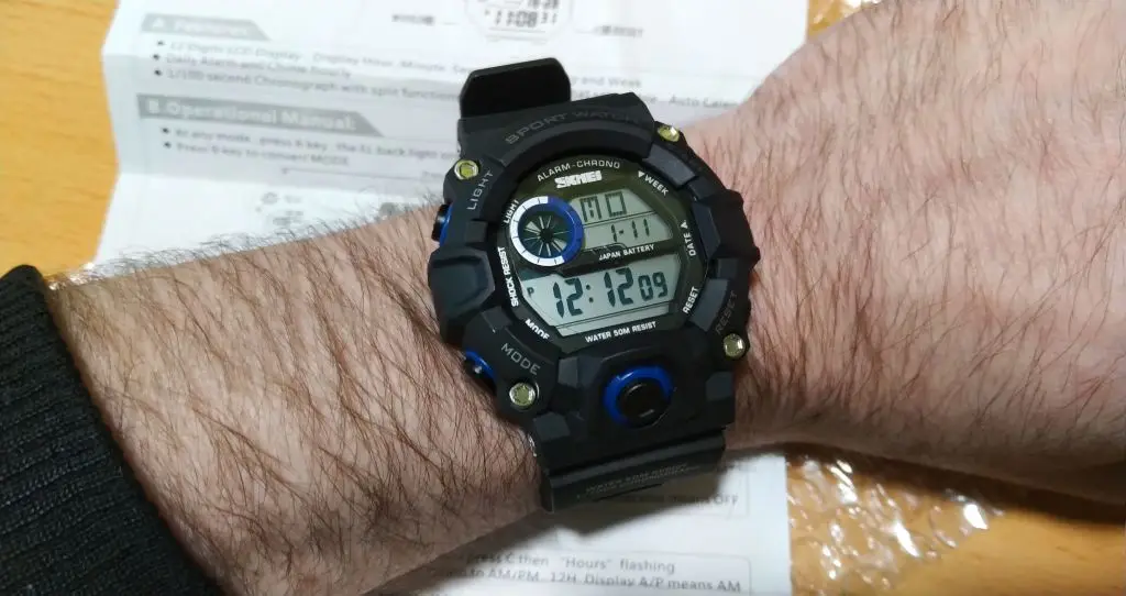 The watch is as it is described by the seller but for the color. I picked the blue one and it is not exactly blue but more like violet. However, it is fine. The watch looks robust although I wouldn't use to swim. The shipping was ultra fast, only 8 days to arrive at Spain. The watch came inside a bubble envelope with another layer of bubbles plastic. There is a plastic transparent sticker in both sides of the watch to protect it. There is a one page manual in English and Chinese only. The configuration is easy so it is noy a problem at all. I would like to thank the customer service which was very support in my command. Thanks guys!