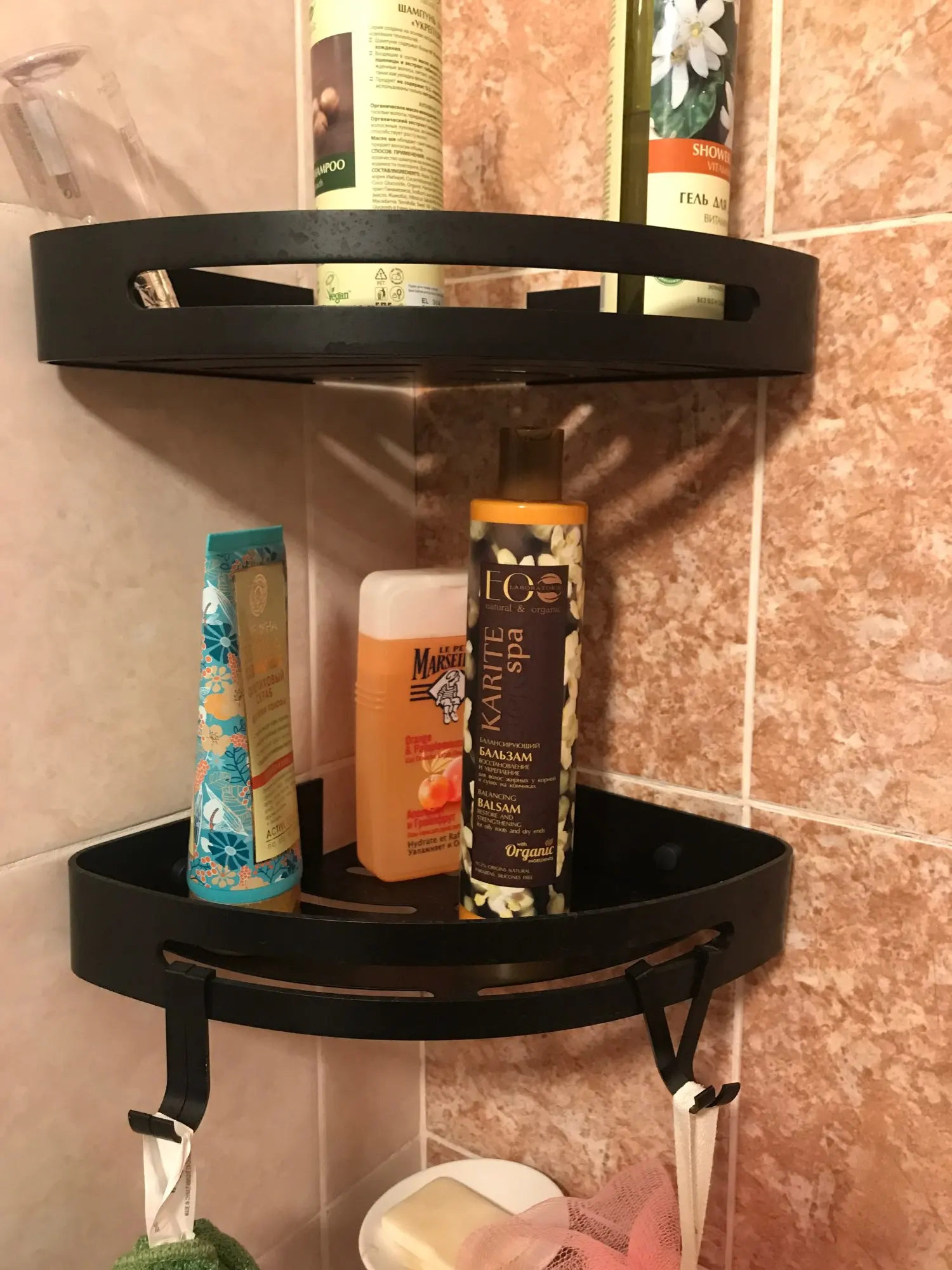 Красивые и очень удобные полки. Все поместилось и красиво смотрится в ванной.