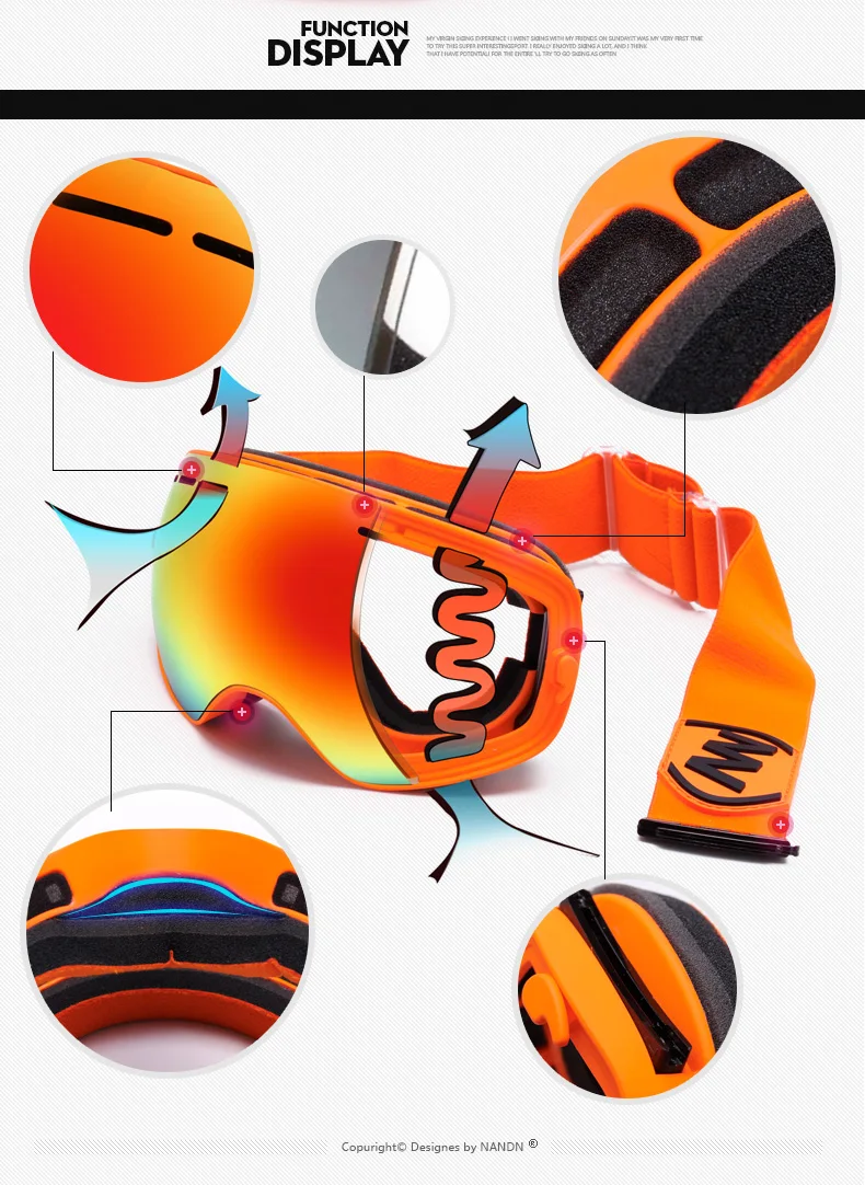 ·Благодаря сильному солнечному светильник, отражающий светильник от Снежной Горы и холодного ветра, который стимулирует глаза, мы предлагаем вам выбрать профессиональные защитные лыжные очки, в то время как бренд «COPOZZ»-Ваш лучший выбор. NANDN SNOW ski goggle больше подходит для вашего лица и защищает ваши глаза от сильного ветра. Объектив изготовлен из импортного материала и его зеркальное покрытие закалено, устойчиво к царапинам и истиранию. Очки 100% антиуф, играют важную роль в защите глаз
