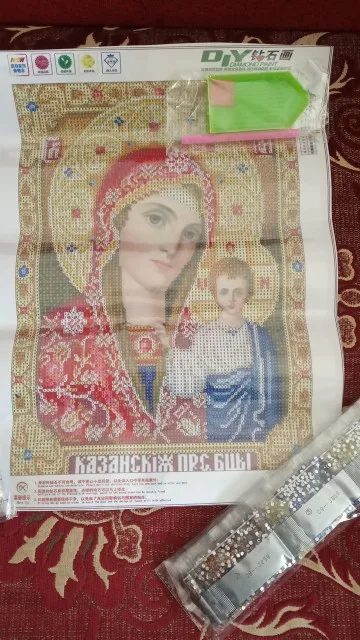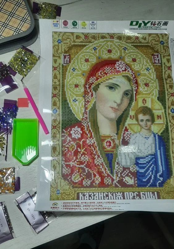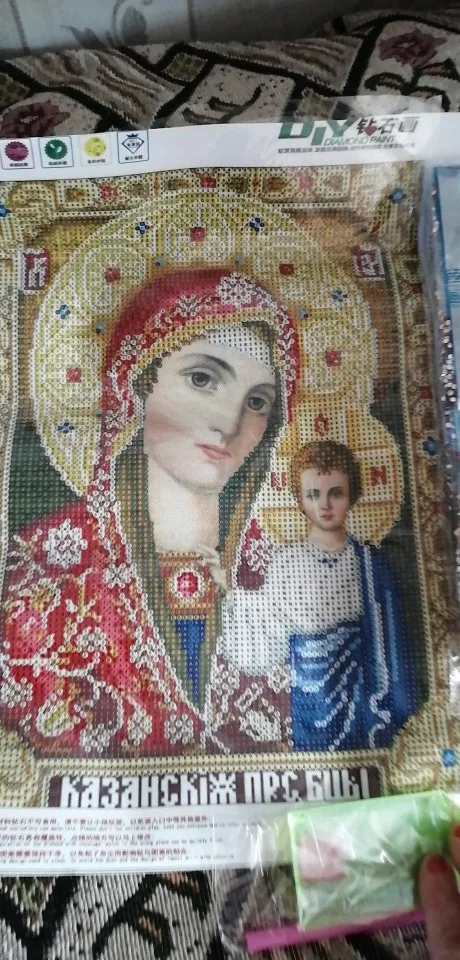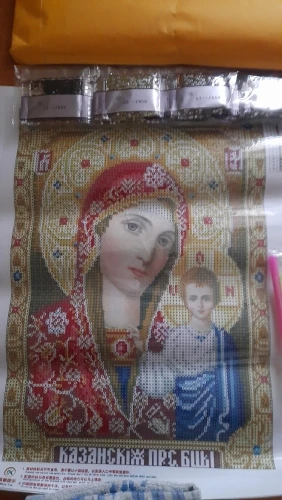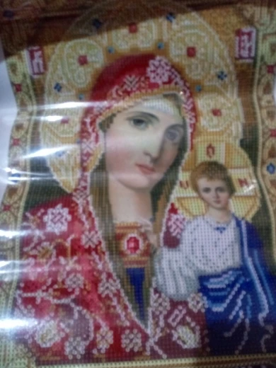 Икона просто замечательная, очень красивая! Давно мечтала о ней. Качество полотна отличное, рисунок яркий, пропечатка хорошая. Стразы мерцающие, по качеству пока не скажу, иногда видны немного потёртые. Инструмент стандартный. Доставка быстрая, приехала картина в целости. Спасибо продавцу за быструю отправку и оценку, т.к. сразу заказывала 4 картины 11.11.20. Однозначно рекомендую продавца!!!!!