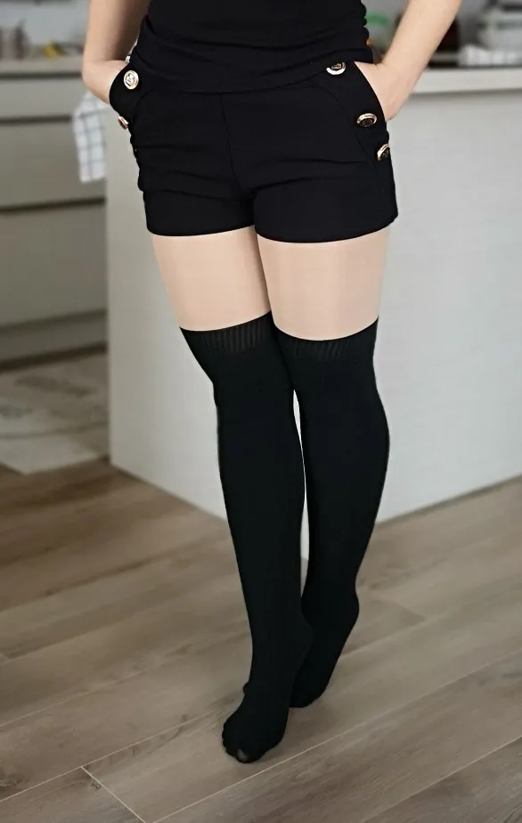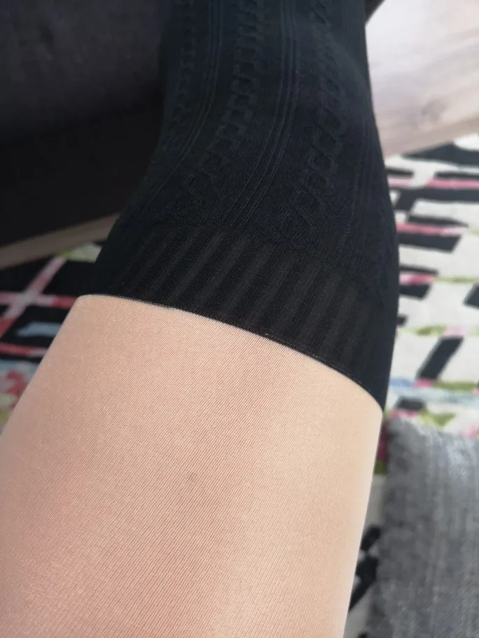 Колготки пришли за 2 недели, трек отслеживался. Подойдут на размер 44, рост 173 см, на стройную фигуру. В месте, где начинаются гольфы, плотная мягкая ткань.