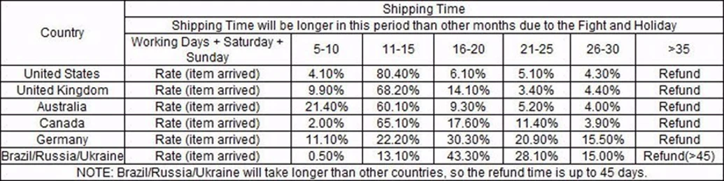 1) Все товары будут отправлены в течение 2 рабочих дней после подтверждения оплаты.2) товары отправляются из Китая авиапочтой, доставка в большинство стран в течение 10-20 рабочих дней. Вот время доставки авиапочтой Китая(Примечание: рабочий день)