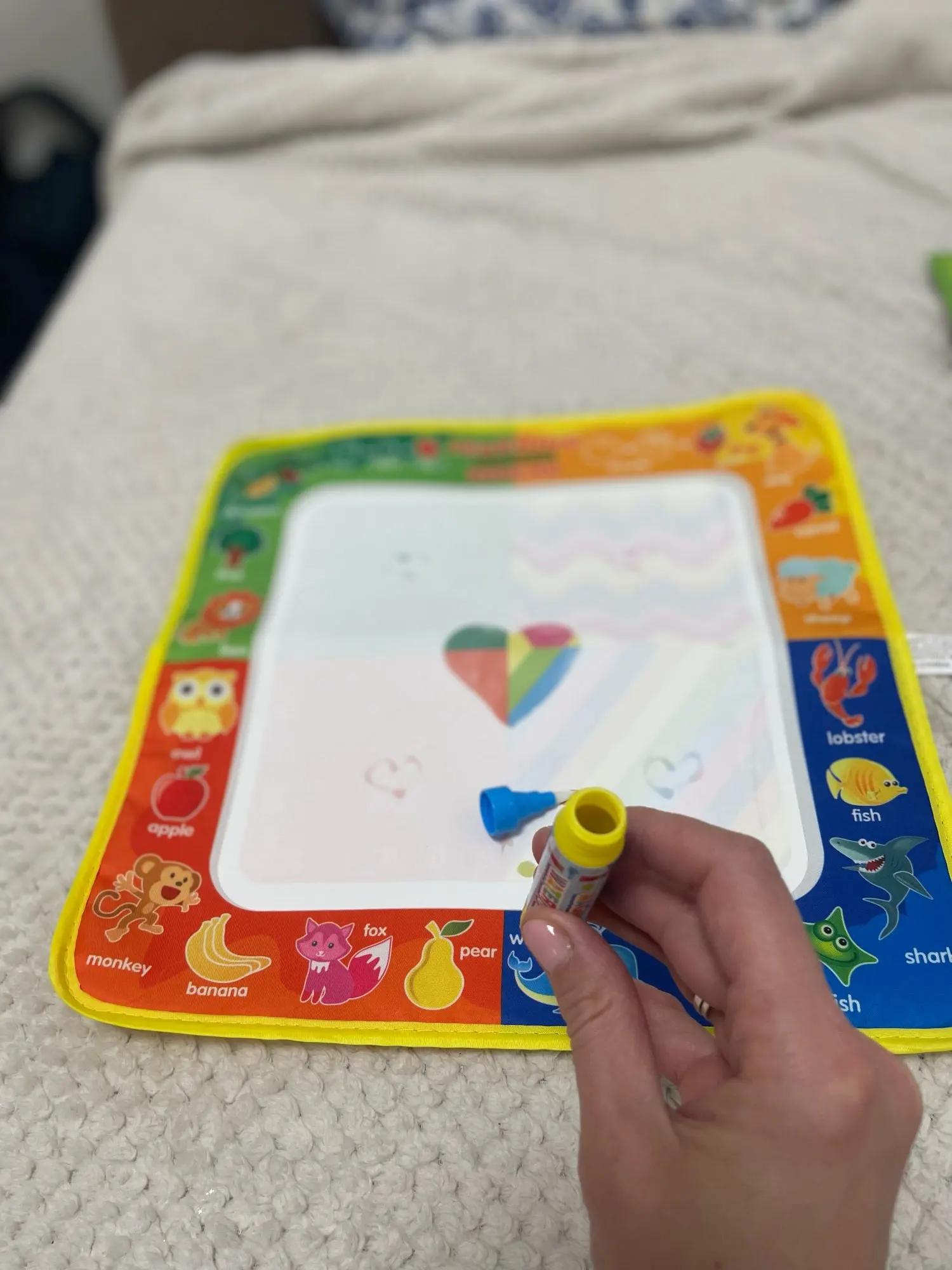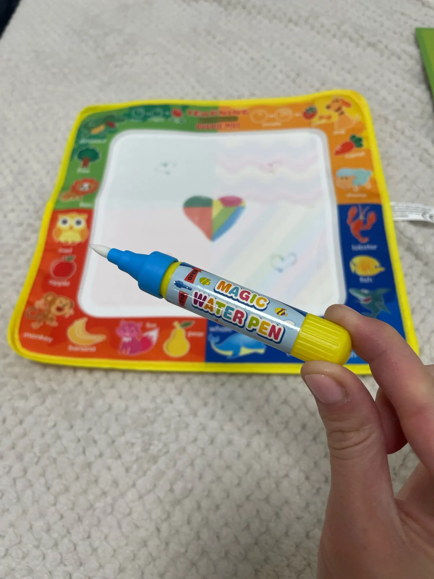 Классная тканевая водная раскраска . Я взяла квадратную. 4 разных рисунка на ней. Легко рисовать. Цвета красиво проявляются исчезают за несколько минут. Воды в карандаше хватает очень на долго. Дочке нравится играться .Товар пришёл быстро. Спасибо продавцу