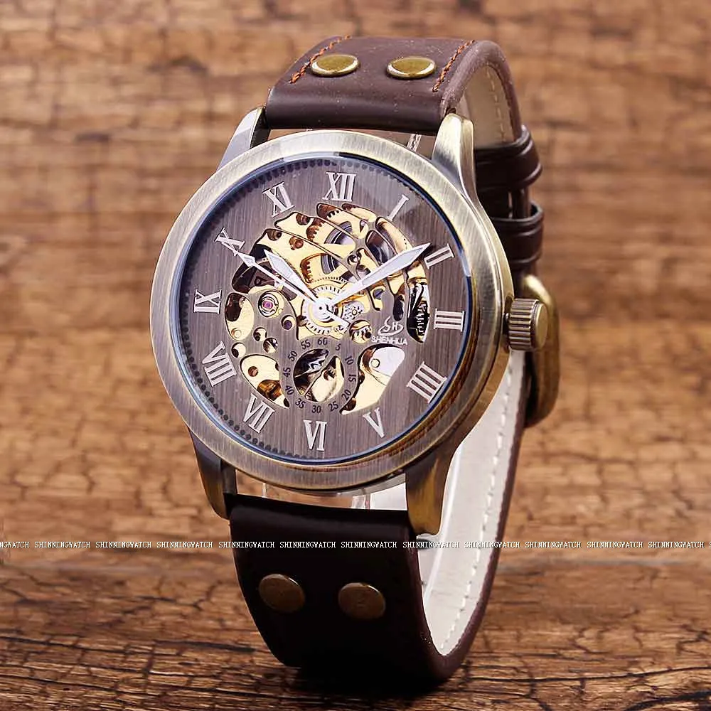 Часы наручные мужские механические в стиле ретро, брендовые автоматические механические, с кожаным ремешком