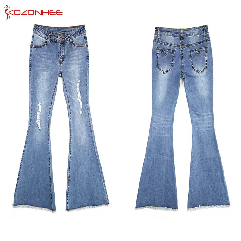 Kozonhee кисточкой рваные Flare Джинсы для женщин Для женщин длинные расклешенные-Низ Джинсы для женщин растяжения для Обувь для девочек Мотобрюки для Для женщин Джинсы для женщин большой размеры