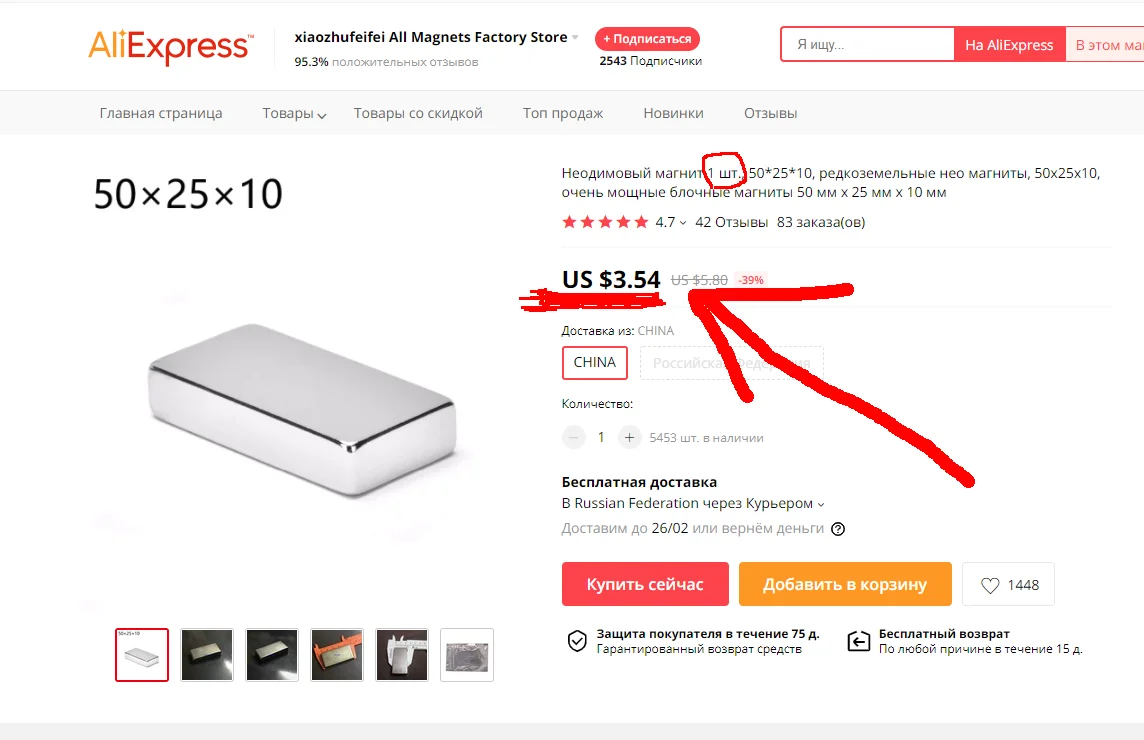 В лоте 2 шт. Мне как раз и нужно было 2 шт. Приехал только один магнит. Второй магнит продавец присылать отказался и собирается вернуть лишь половину за заказ. Переписку со мной продавец начал игнорировать и я создал спор. Ведь за половину я никак не смогу купить один магнит, так как один стоит дороже. А еще два мне не нужно. Я требовал, чтобы продавец привез мне второй магнит, так как это его ошибка и его вина. АliExpress в споре вообще не поддержал меня и сделал все так как удобно продавцу. За много лет покупок на АliExpress впервые встречаю такого наглого и не честного продавца.