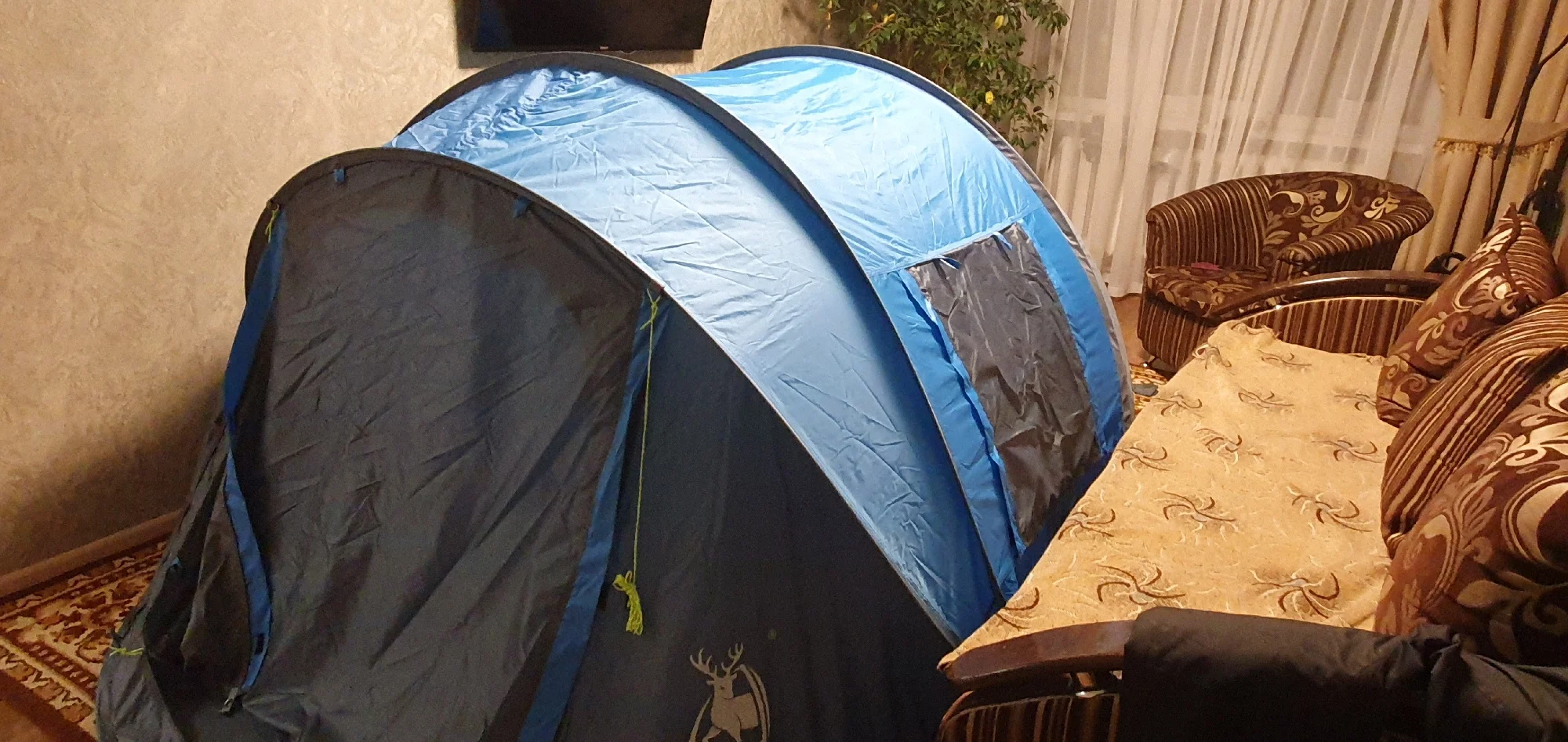 отличная палатка , мгновенно разбирается, собирается тоже быстро (но нужно попрактиковаться). По качеству лучше, чем наша предыдущая из магазина. Мы брали на 2х человек палатку побольше- на 3-4, чтобы было свободное место и больше пространства для воздуха. При желании реально можно положить и 4х человек. В палатке можно без проблем сидеть, сгибаться не нужно. Если не забуду - скину фотки в рабочем виде
