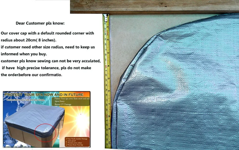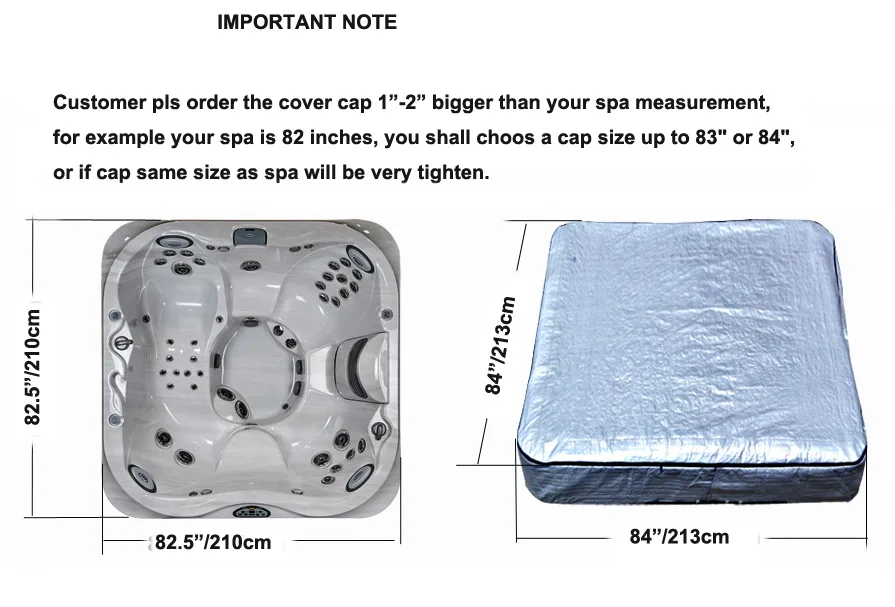 Эти крышки соответствуют реальным размерам, пожалуйста, выберите крышку на размер больше, чем ваш спа-салон, например, ваш спа-салон составляет 82 дюйма, вы должны выбрать размер крышки до 83 "или 84", или если Кепка того же размера, что и спа, будет очень затянута.