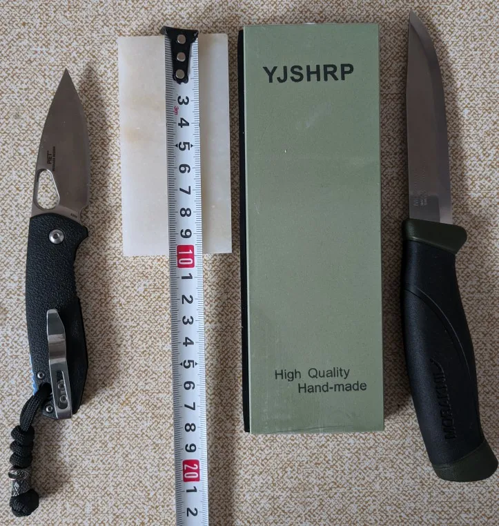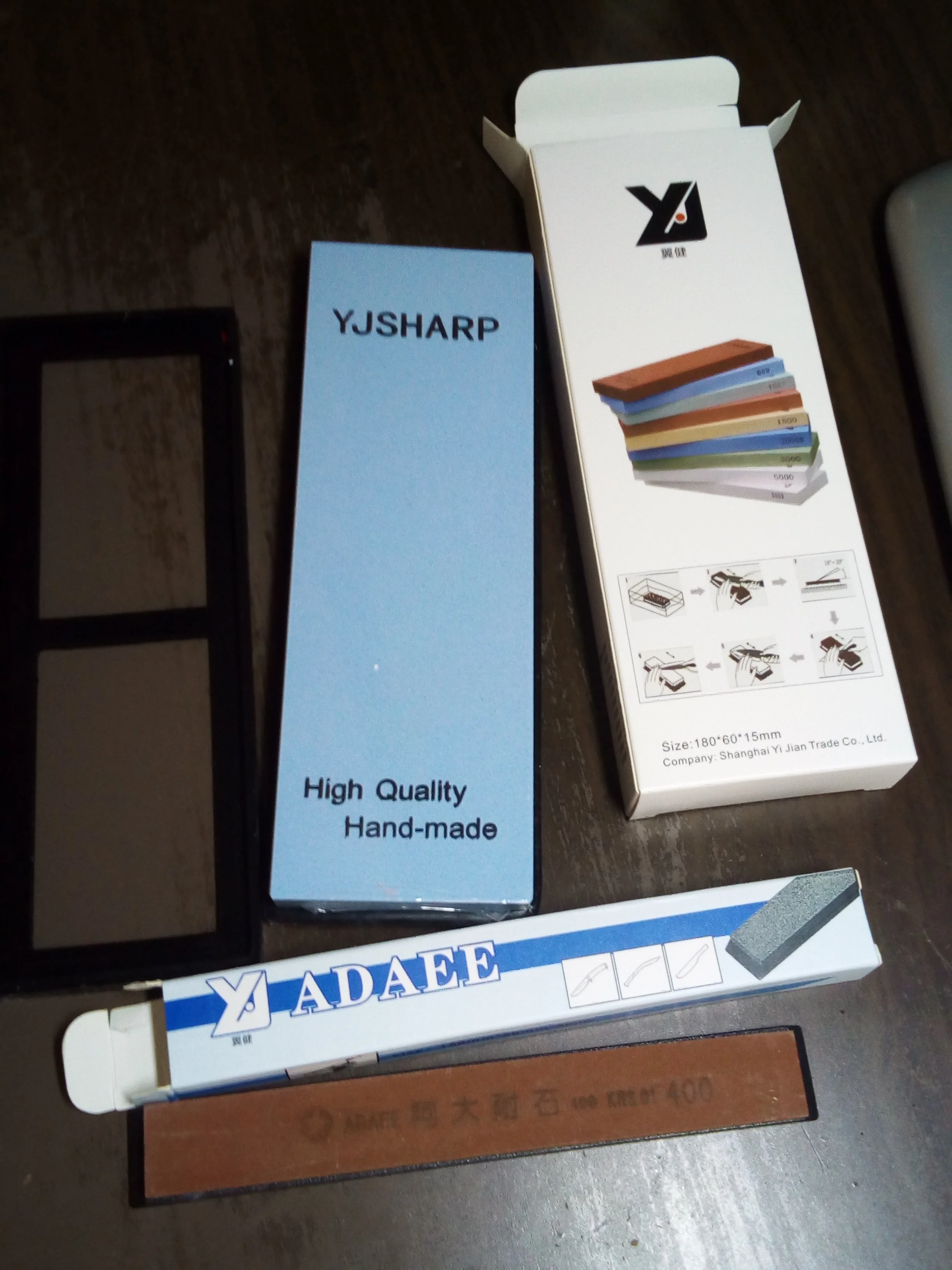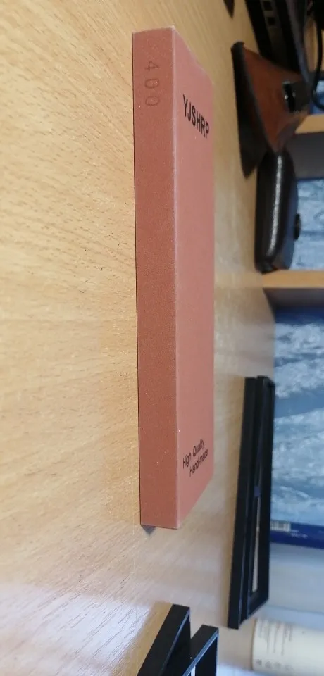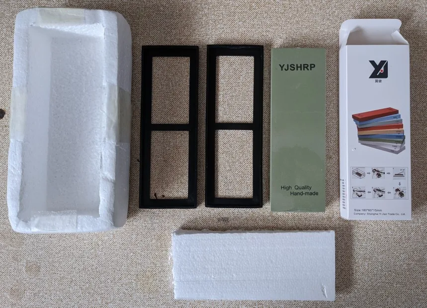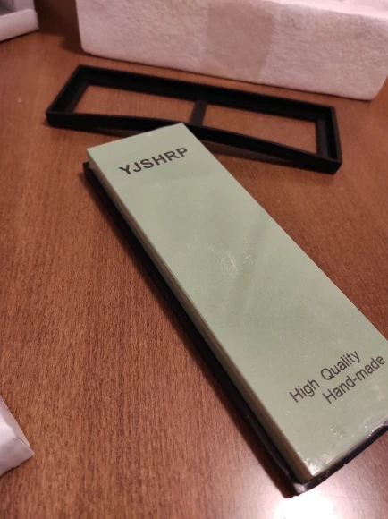 Камень хорошего качества, но гритность я пока не проверял. Имеются две обхватывающие резинки, так что можно просто так класть на стол и точить, скользить не будет. При доставке каждый камень обернут в целлофан, надеты резинки, упакован в картонную коробочку, которая помещена в пенопластовый бокс. Очень быстрая доставка - 3 дня в город Рязань (Россия), наверное доставка со склада в где-нибудь Москве.