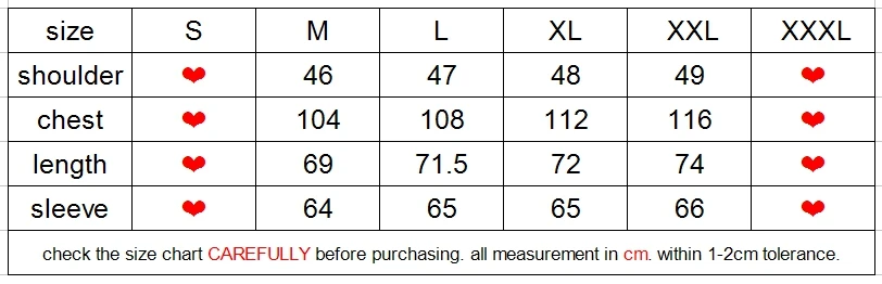 Пожалуйста, проверьте таблицу размеров и измерьте вашу куртку, как показано ниже.