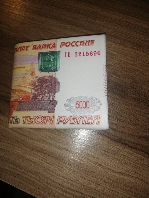 Прикольный,один в один как на фото,необычно выглядит,обращает на себя все взгляды в магазинах,,крепкий ,сшит аккуратно!,рекомендую(брала российскую пятитысячную)