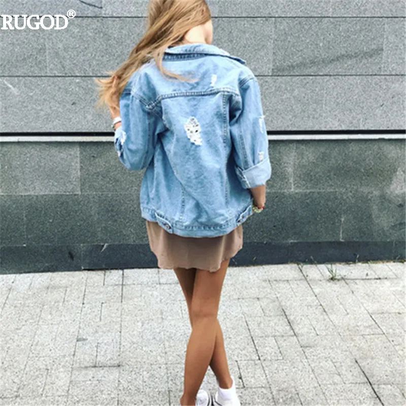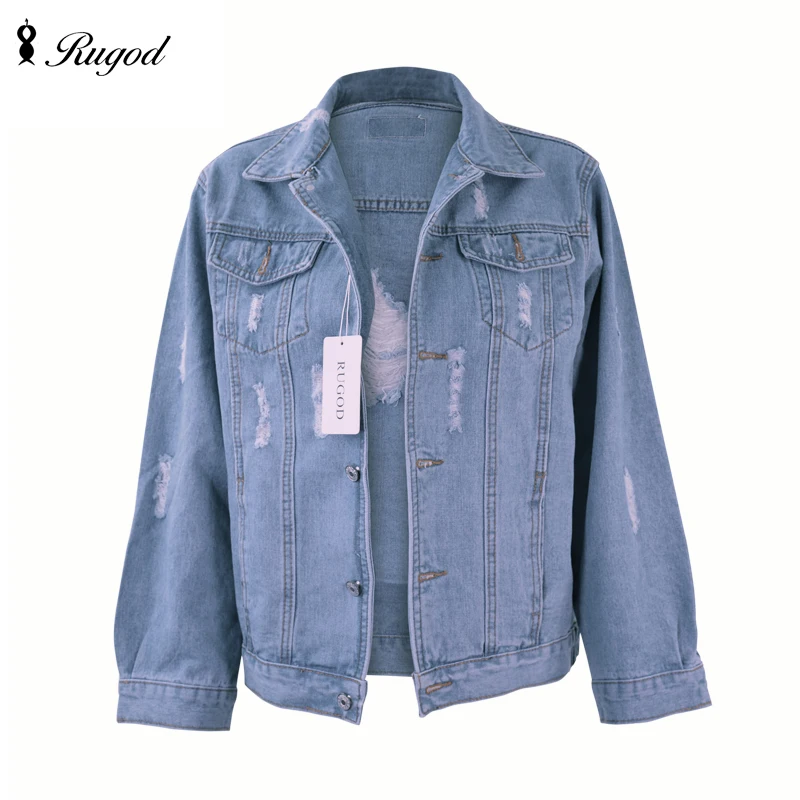 Rugod оптовая продажа одноцветное пальто Осенне-зимняя Дамская обувь рваные джинсовая куртка Femme в винтажном стиле, с длинным рукавом джинсовая куртка-бомбер повседневное пальто джинсовая куртка женская