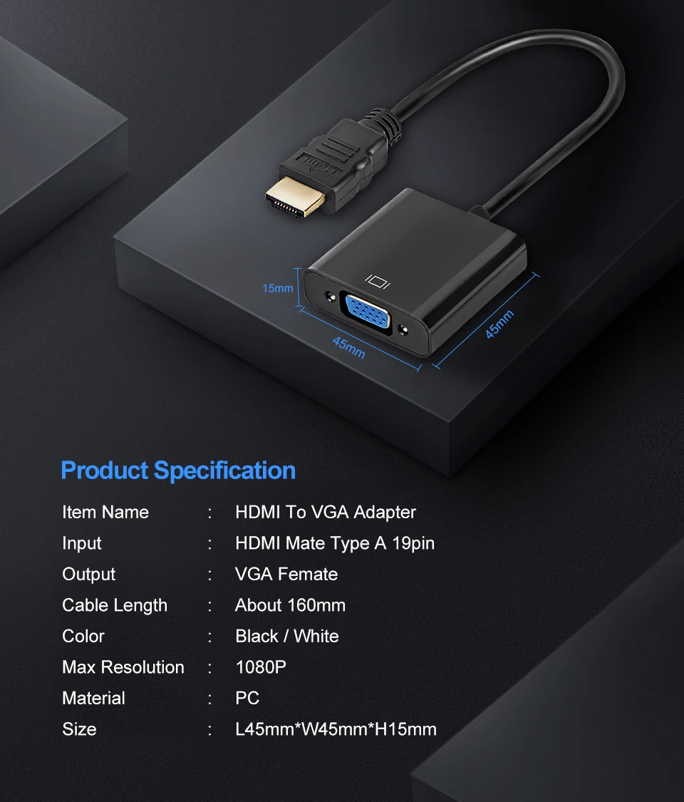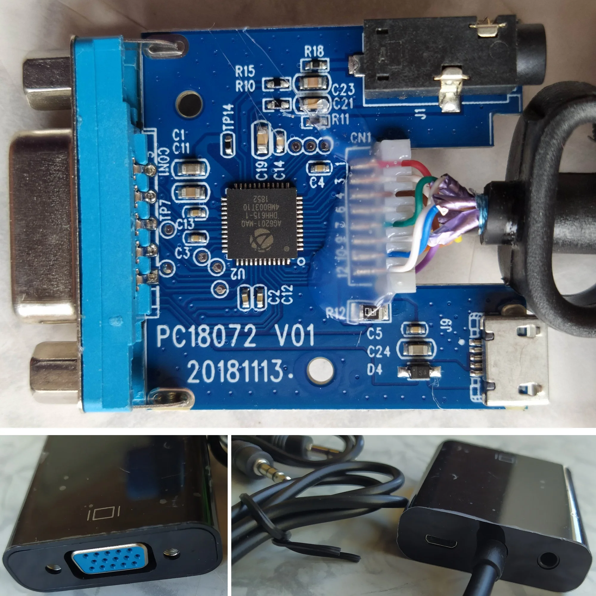 Всё отлично, работает. Брал для спутникового тюнера и старого ЖК монитора, у которого нет HDMI входа, есть только DVI и VGA(D-Sub). Мой монитор поддерживает максимум 1080p@60Hz, так что проверил работу только до этого разрешения. Проверил заодно и 480P, 576P, 720P, тоже работало. Но если на тюнере случайно выставить 1080i@60Hz, то монитор уже пишет "вне диапазона" (мой монитор не поддерживает "i" - чересстрочная развёртка), и приходилось подключать тюнер к другому телевизору (с поддержкой "i") и выставлять разрешение 1080p ("p" - прогрессивная развертка). Звук работает, подключал колонки и наушники (первый раз вставлялось туго, пришлось приложить усилия, чтобы вставить разъём до упора). Так же проверил работу переходника на видеорегистраторе и на Orange Pi (аналог Raspberry Pi). Кабеля в комплекте по 50см. Заработало и без дополнительного USB питания. Внутри микросхема AG6201-MAQ. Товар выслали в течение дня, в зип пакете и в пупырчатом пакете. Доехало за 23 дня. Посылка отслеживалась.