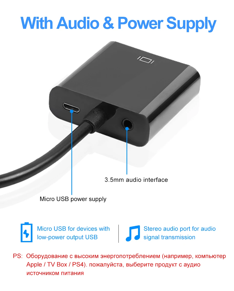 Конвертер не самого лучшего качества. Разрешение изображения до 720р., в 1080р картинка пропадает (чёрный экран). Аудио выход джек3,5 работает, но громкость ниже в 2 раза, чем через альтернативные выходы. Usb питание по ходу не работает. Подключил зарядник от телефона через амперметр. Замерил потребление : 0,01 А.