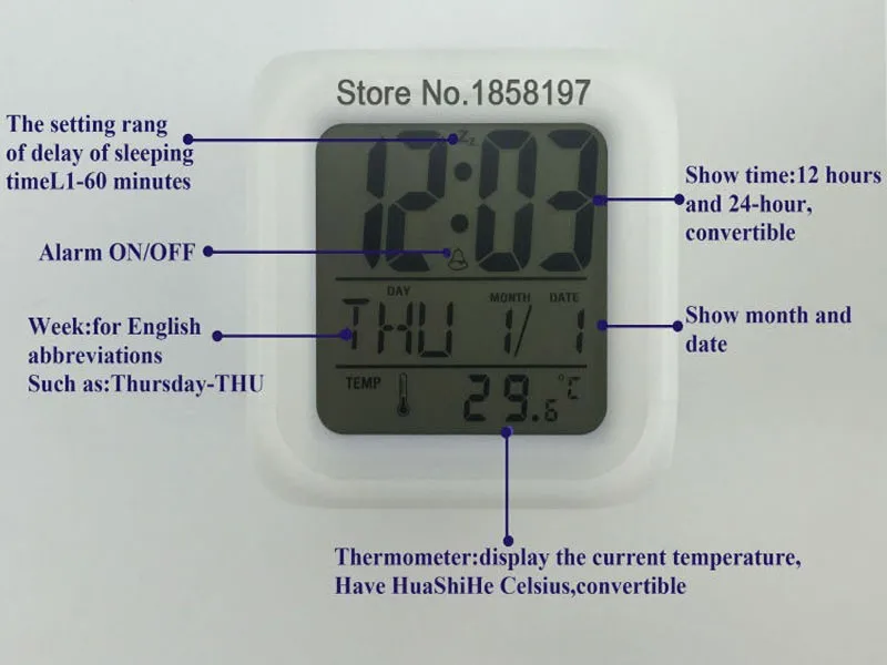 2. Светящийся светодиодный светильник с 7 разными цветами.3. Поддержка 12-часовой и 24-часовой формат времени, календарь, температуры и сигналу тревоги при сбое.4. Функция будильника и сна5. Отображение времени, недели данных и температуры6.При нажатии на верхнюю часть часов часы включат светильник и изменят цвета в течение нескольких секунд.
