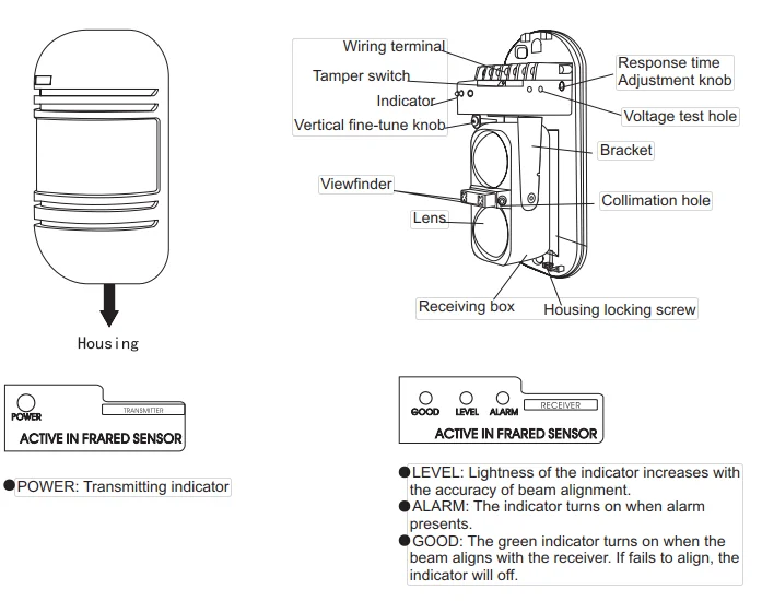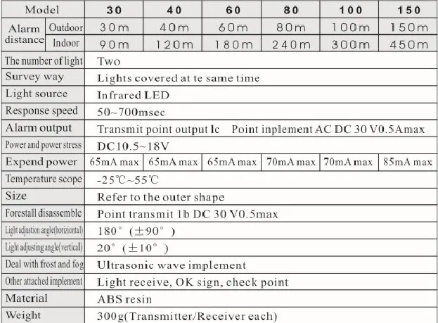 1. Количество балок: 2 Балки2. Режим Dtection: 2 луча блокируются одновременно3. Оптический Источник: Инфракрасный цифровой импульсный луч4. Детектор: 80-150 м5. Скорость отклика: 50 ~ 700msec6. Релейный контакт: NO.NC7. Вес: 900 г8. Источник питания: DC12 ~ 24 В9. Ось регулировки уровня: 180 ° ± 90 °10. Вертикальная ось регулировки: ± 10 °11. Рабочая температура: -25 °C - 55 °C12. Рабочая влажность: 5% - 95% RH (относительная влажность)13. Материал: АБС-пластик, канифоль