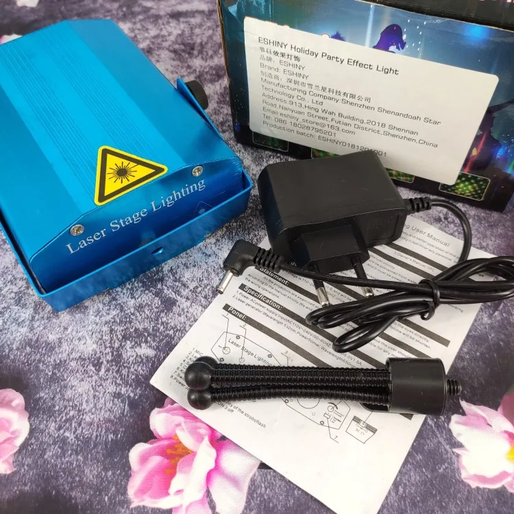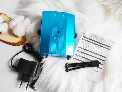 Лазерный мини-проектор 24 узора от ESHINY Проектор очень крутой и интересный, рисунки четкие ребенок восторги. Такой проектор можно использовать на праздники для детей, так же на крупных мероприятиях охват очень большой. В комплекте идет сам проектор, шнур питания работает от электричества, триношка и инструкция все это в аккуратной коробке. Проектор можно подвешивать, на нем есть специальная балка и так же ставить на триношку, для ее есть отверстие легко собрать. Узоры как я уже говорила четкие, грибы, рыбки, сердечки можно менять ритм узоров, или поставить один или просто все быстро меняются. Проектор можно спрягать с музыкой и тогда узоры меняются в такт музыки. Выполнен очень хорошо синий металлический корпус, все ровное и не поцарапаное. Посылка пришла быстро упаковка хорошая, товар очень понравился рекомендую к покупке.