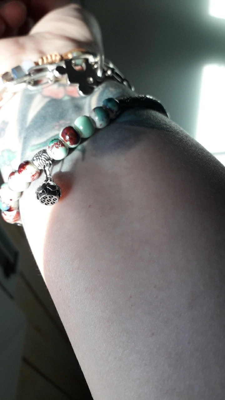 милый браслет, на резинке, на узкое запястье хорошо облигает. На картинке выглядит более массивным, в реальности скромненький, едва заметный на руке. При этом очень комфортный.