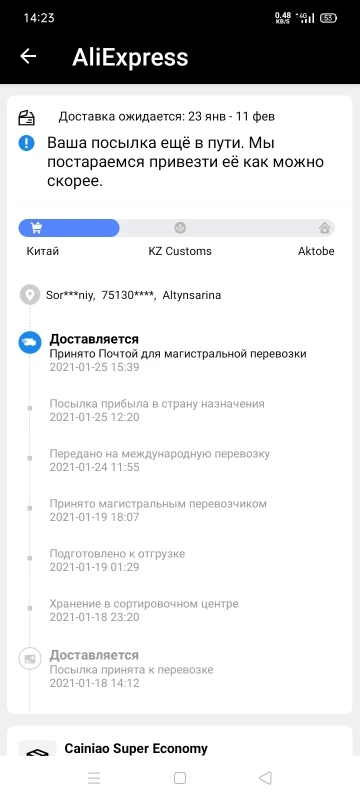Страна: KZ Доставка: Cainiao Super Economy 12.01.2021