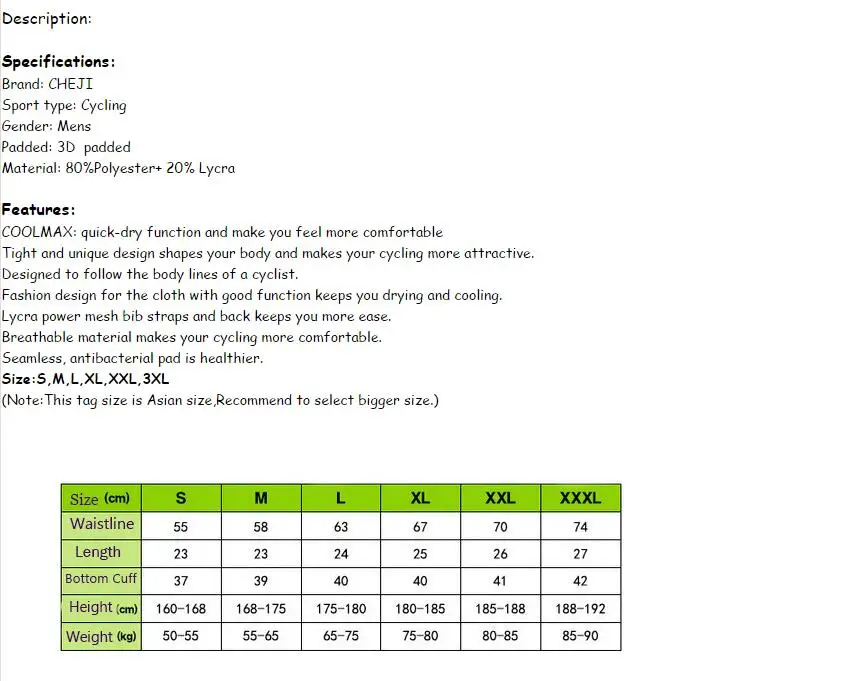 Примечание:Указанные размеры основаны на азиатских размерах. Если вы заказываете товары за пределами Азии, рекомендуется выбирать больший размер, чем обычно.Описание:Характеристики:Тип спорта: ВелоспортПол: мужчинПодкладка: 3D ПодкладкаМатериал: 80% полиэстер + 20% лайкраОсобенности:COOLMAX: функция быстрого высыхания позволяет чувствовать себя более комфортно;Плотный и уникальный дизайн формирует ваше тело и делает ваш Велоспорт более привлекательным;Предназначен для следования линии тела велосипедиста;Модный дизайн для ткани с хорошей функцией обеспечивает сушка и охлаждение;Сетчатые лямки и спинка из лайкры обеспечивают большую легкость;Дышащий материал делает вашу езду более комфортной;Бесшовные антибактериальные подушечки более здоровые.Размер: S, M, L, XL, XXL, 3XL(Примечание: этот размер соответствует азиатскому размеру, рекомендуем выбрать больший размер.)Велосипедные шорты из спандекса и полиэстера Красного, черного и зеленого цветов. Доступны размеры S, M, L, XL, XXL и XXXL.