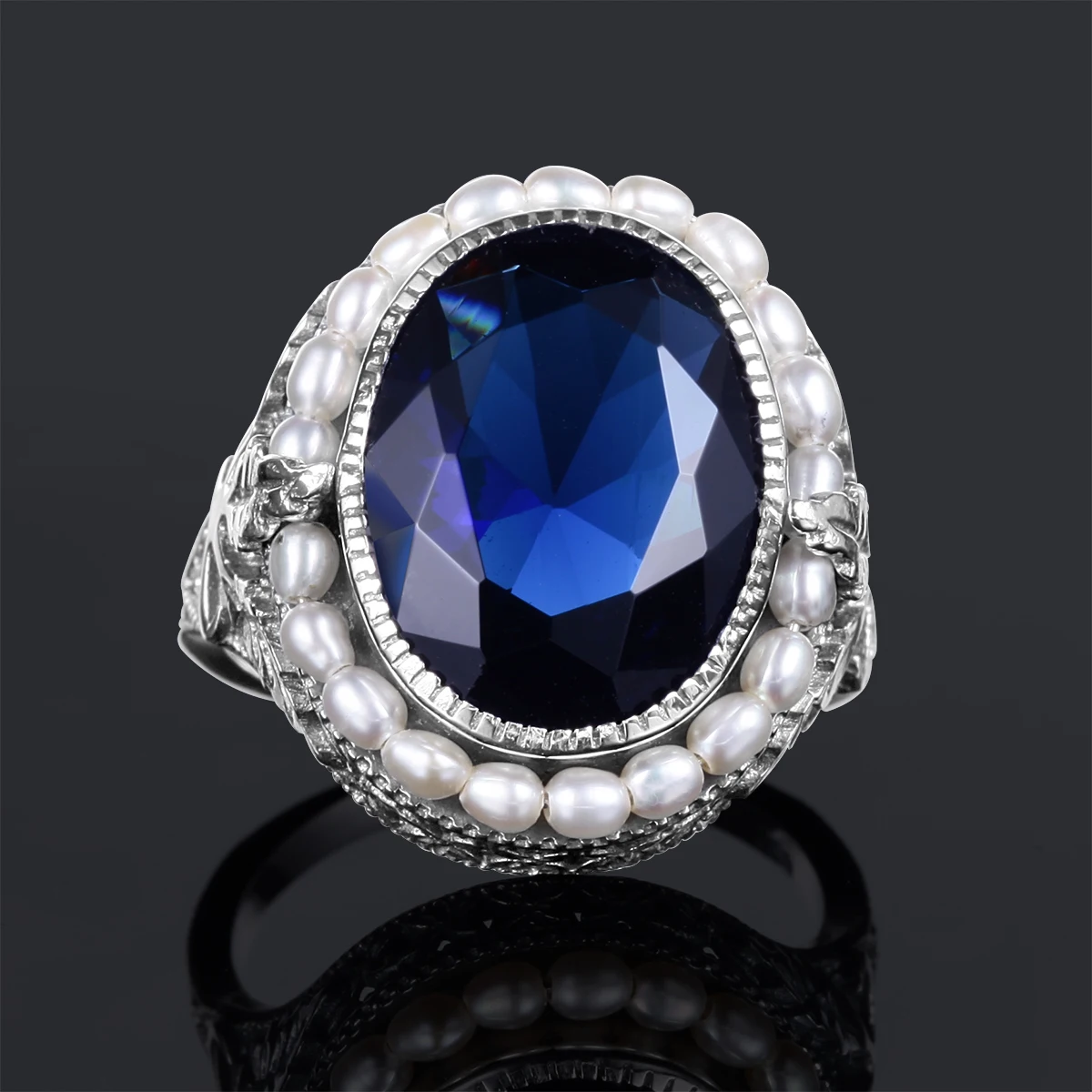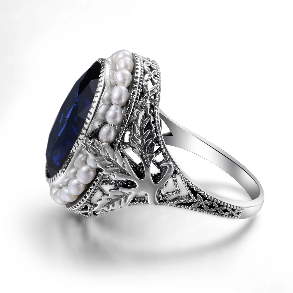 Металл: 100% 925 пробы сереброОсновной камень: Синтетический сапфирБоковой камень: натуральный жемчуг пресной водыРазмер камня: 12*16 ммЦвет камня: синийЦвет металла: античное сереброСтиль: винтажныйШтамп: 925Вес: 6,8 г