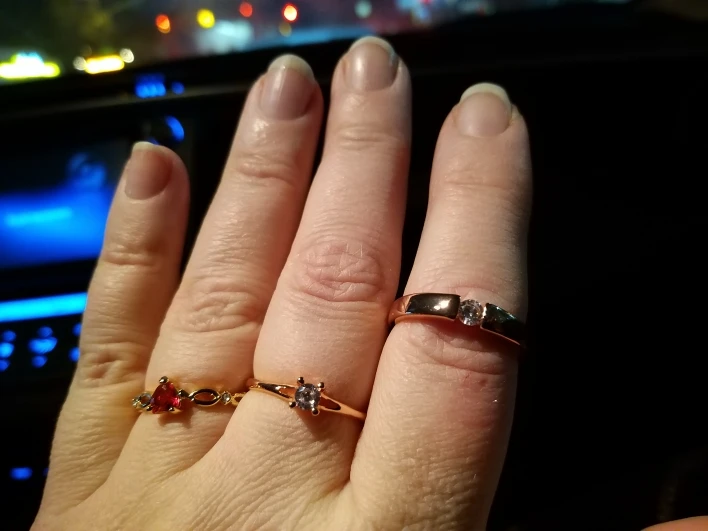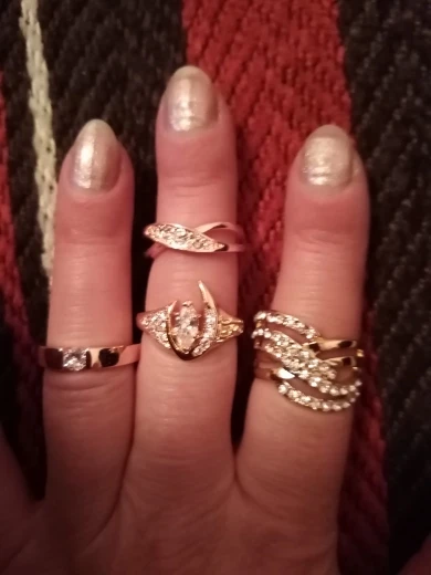 Вся бижутерия очень красивая, сделана качественно. Колечко стильное, толстоватое. Был бы камешек поменьше, сошел бы за брюлик, но и так хорошо смотрится. Доставка быстрая. Фото соответствует Выглядит, как золотое. Покупкой довольна.