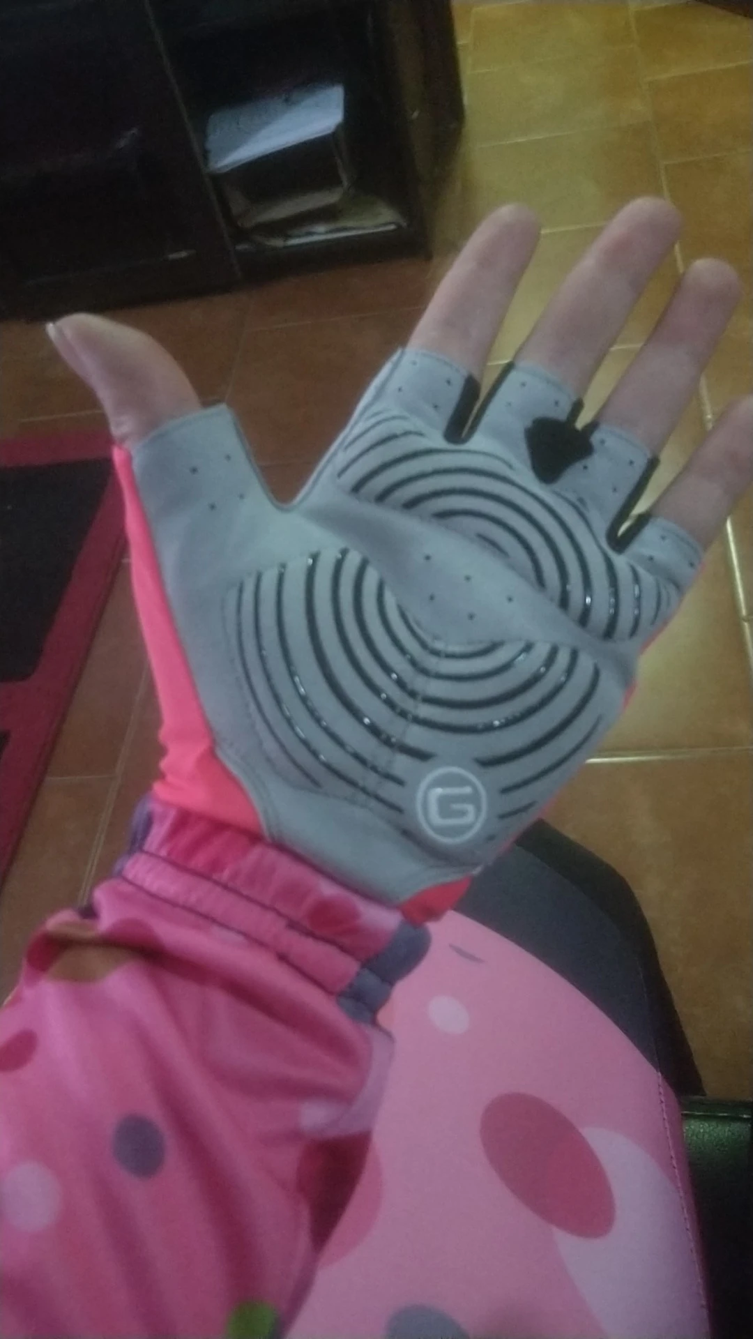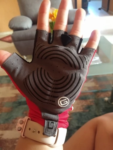 Прекрасные перчатки. Очень удобно сидят на руке. Похоже, что в утолщениях действительно гель. Чёрные линии на ладони и белые на тыльной стороне из материала, напоминающего силикон. Цвет очень красивый, насыщенный.