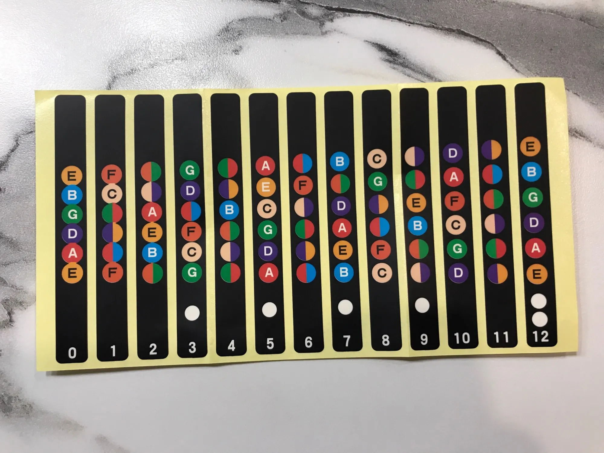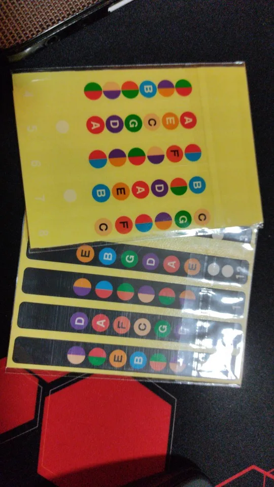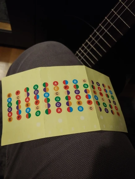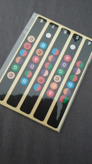 Вещь довольно полезная для музыкальной грамотности - повышает желание выучить ноты, ибо получается это не так нудно :D Мне стало проще ориентироваться по грифу, быстрее стал запоминать, где какая нота. При игре не мешают. Наклеил впритык к соответствующему ладу - по мне так удобнее.