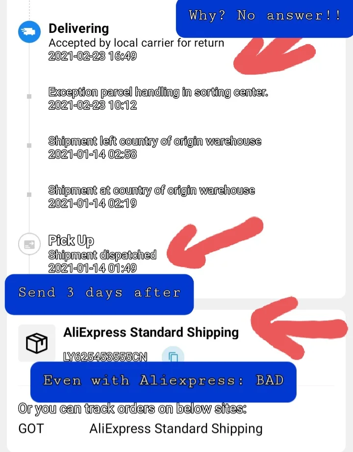 Продавец отправил мне 3 маленькие вещи 3 дня. Я заплатил дорогую доставку ($6,57), чтобы получить быстрый VIP-сервис. Нет возможности! Им все равно. Сообщения? Всегда одинаковые предложения (копия-вставка!). Болезненно получить мои деньги обратно. Aliexpress становится все хуже каждый месяц. Даже я честный хороший покупатель (Платиновый член, почти алмаз). Я предпочитаю Walmart, Amazon, потому что они возвращают деньги сразу же. Не рекомендуется покупать на ALIEXPRESS непрофессионально, лениво.