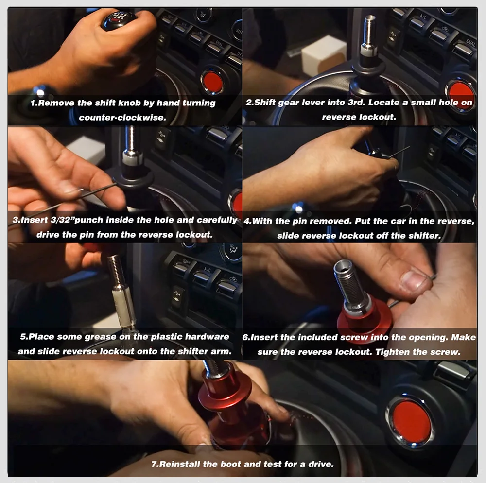 Инструкция по установке:1. Снимите ручку переключения, поворачивая вручную против часовой стрелки.2. Рычаг переключения передач на 3. Найдите небольшое отверстие на обратной блокировке.3. Вставьте 3/32 "пробойник внутрь отверстия и аккуратно воткните штифт от обратной блокировки.4. С удаленным штифтом. Поставьте автомобиль в обратную сторону, сместите обратную блокировку с переключения передач.5. Поместите немного смазки на пластиковое оборудование и вставьте обратную блокировку на рычаг переключения передач.6. Вставьте включенный винт в отверстие. Убедитесь в обратной блокировке. Затяните винт.7. Переустановите загрузку и протестируйте для привода ..