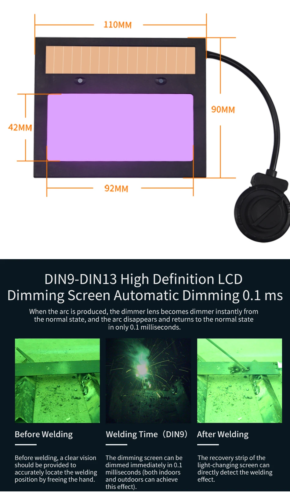 DIN9-DIN13 Регулировка зоны затенения, когда вы используете функцию «шлифовки», можно регулировать зону затенения по ширине, подходит для каждого сварочного аппарата.