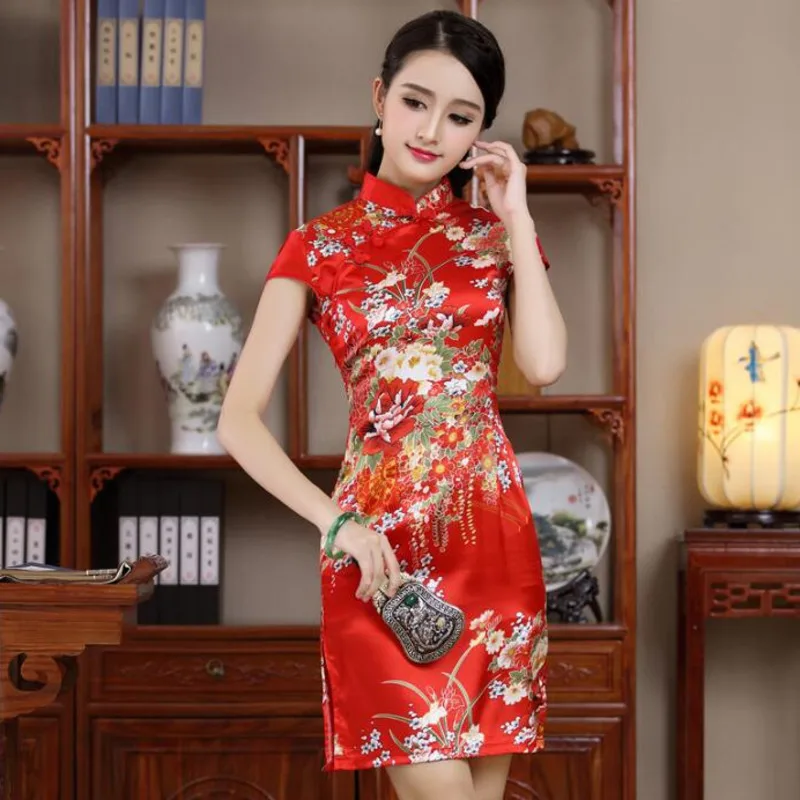 Винтажное китайское традиционное платье-Ципао для женщин, красное шелковое короткое пикантное китайское платье-Ципао из полиэстера, модель Qi в современном стиле