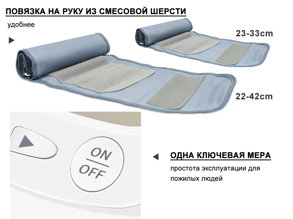 Нет блока для розетки, манжета маленькая, провода все короткие, и громко постоянно говорит по английски.