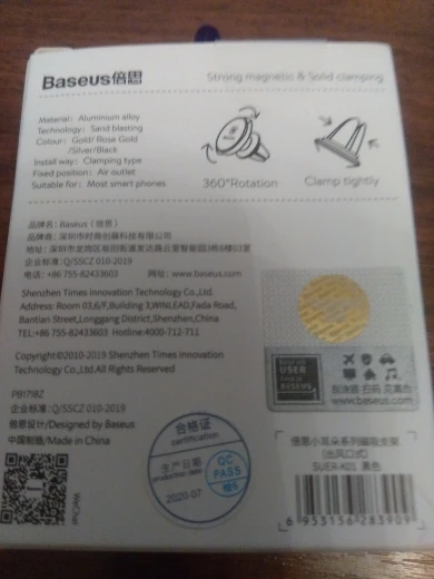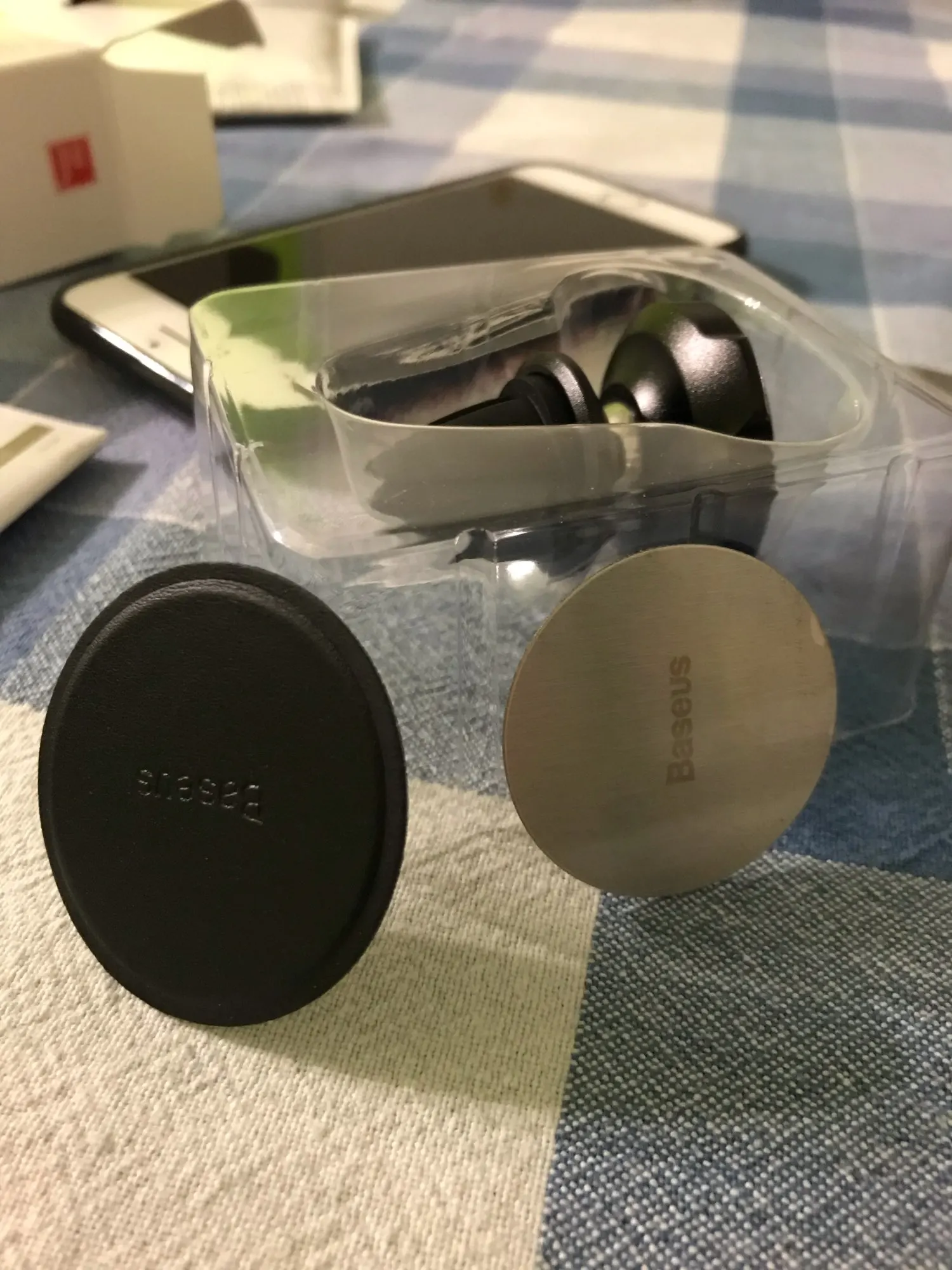 Шло долго конечно и не отслеживалось по России. В целом как всегда качество Базеуса на высоте. В комплекте две пластины металлических для наклеивания на телефон с логотипом, одна блестящая, другая, как будто кожей обтянута, кому что нравится и сам держатель.