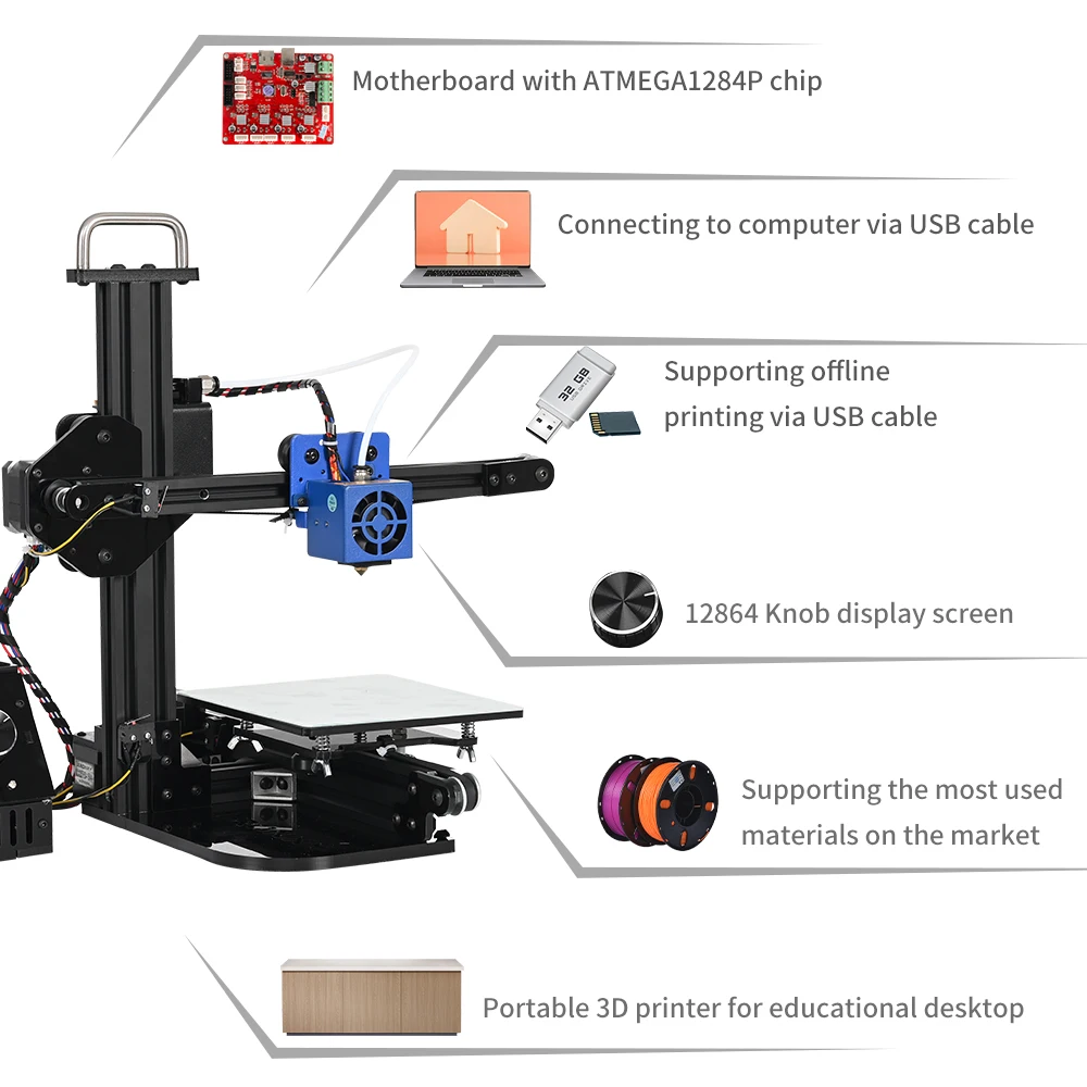 Параметры машины:Размер печати: 150*150*150 ммТолщина печати: 0,1-0,3 ммМатериалы поддерживается: 1,75 мм PLA ABS ПЭТГ Скорость печати: 20 мм-100 мм/сек.Точность позиционирования:X/Y:S0.00625 Z: s0.00125мм Температура окружающей среды: 8 ℃ - 40 ℃Температура сопла: Макс 275 ℃ Программное обеспечение для нарезки: слайсер TronxyФормат файла: STL.OBJ.DAE.AM F.G кодПрограммное обеспечение для работы: Repetier-Host / CuraОперационная система: WindowsПодключение: USB кабель, tf-карта