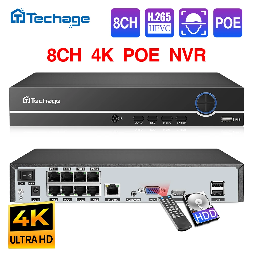 Сетевой видеорегистратор Techage, H.265, 8 каналов, 4 МП, 5 МП, 1080P, 4K, NVR, аудиовыход, сетевой видеорегистратор до 16 каналов для IP-Камеры POE