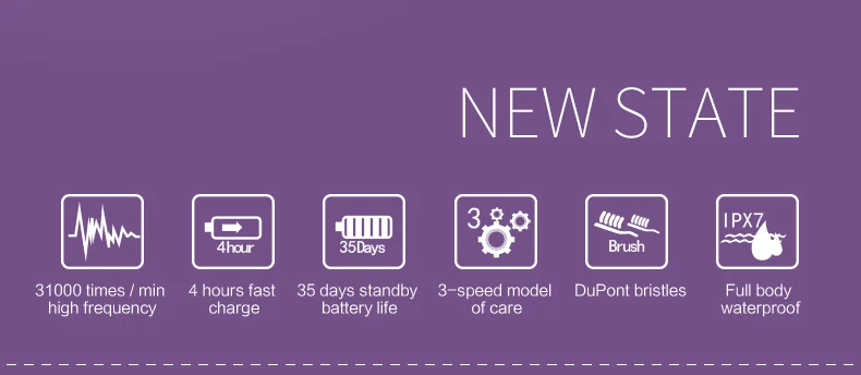 Преимущество:2 минут смарт-таймер30 секунд напоминания об остановкеПредотвращения кариесаЧистый и отбеливания зубовСвежее дыхание улучшает здоровье десенВысокая скорость звуковых волнВ 6 раз чище, чем ручная ЧисткаСША DuPont материал Зубная щетка головка, комфорт и не повреждает зубы3 года, дизайн с передовой технологиейМассажная электрическая зубная щетка, наслаждайтесь чисткой зубов.