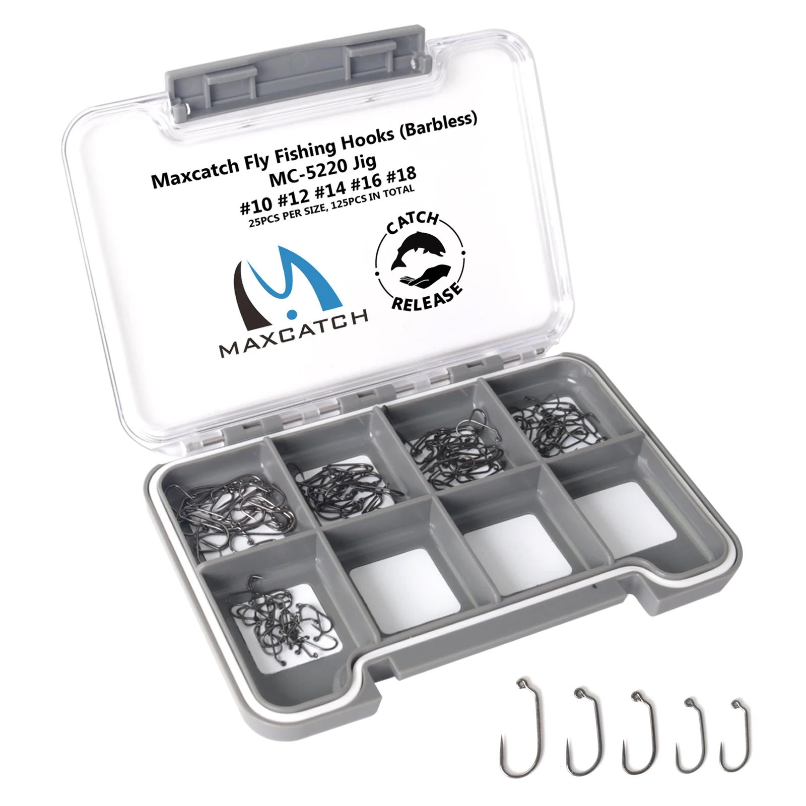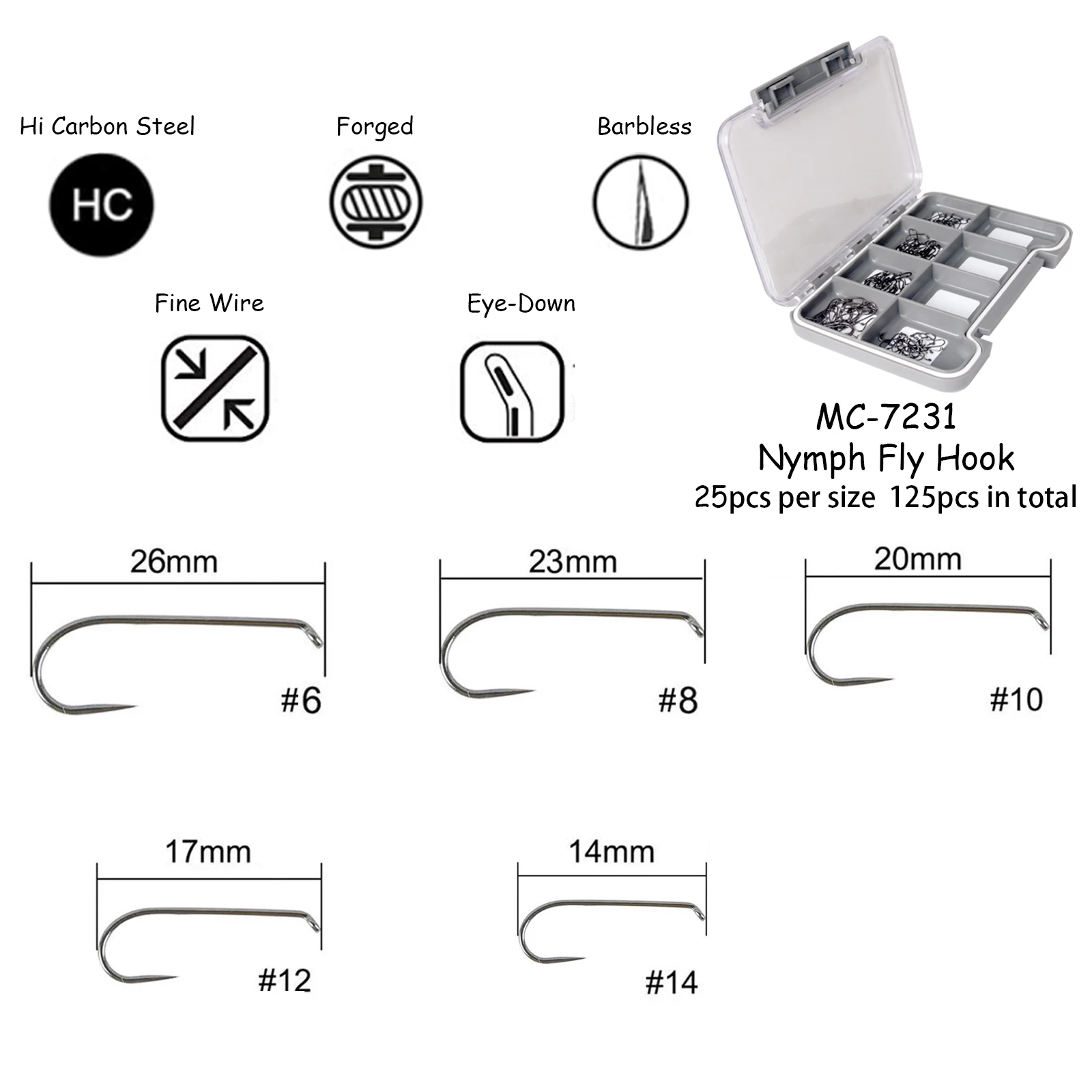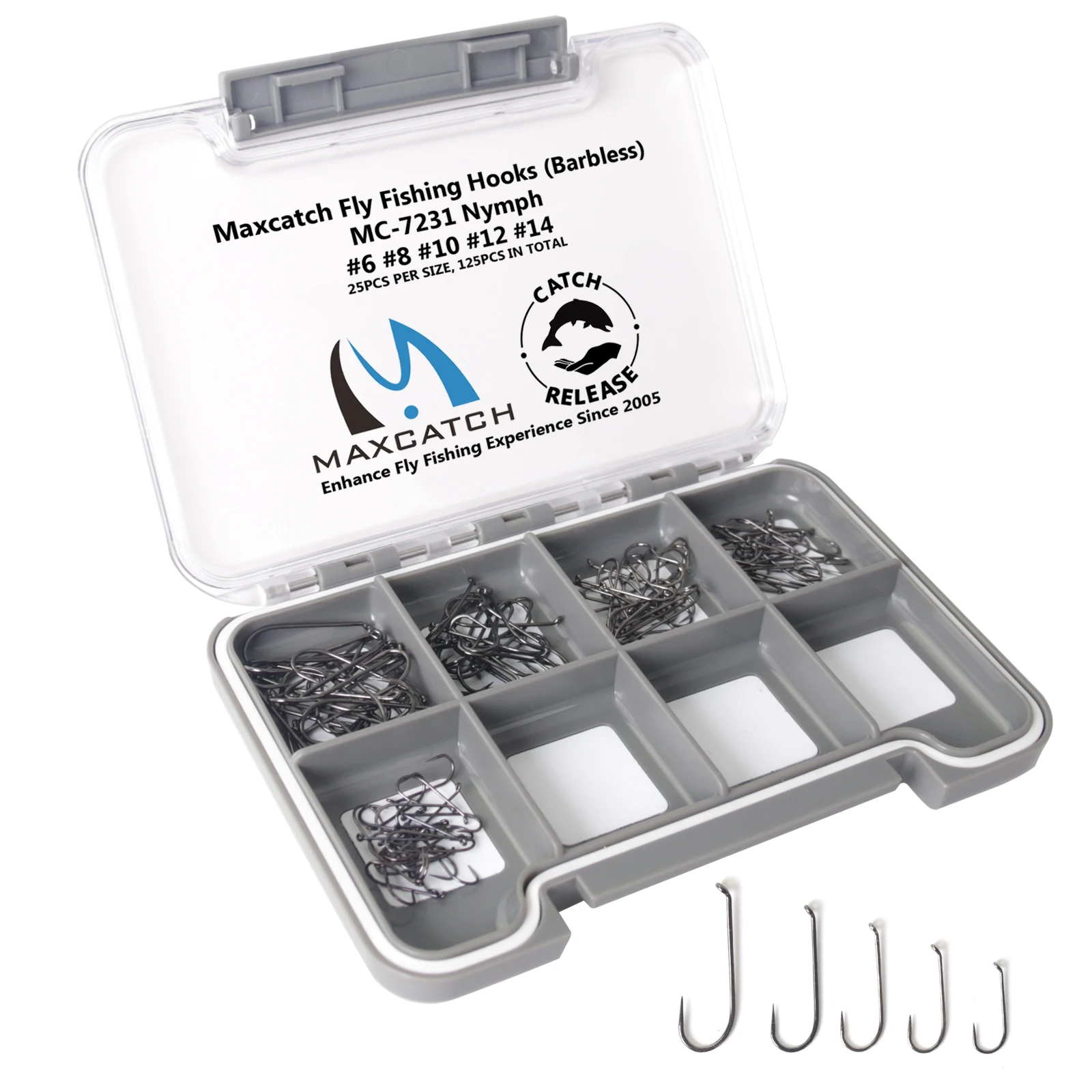 Maximumcatch, 125 шт., 6 #8 #10 #12 #14 #16 #18 #, Безразмерные рыболовные крючки для ловли искусственных мушек, набор джиг-Нимфа, кованые черные никелевые рыболовные крючки