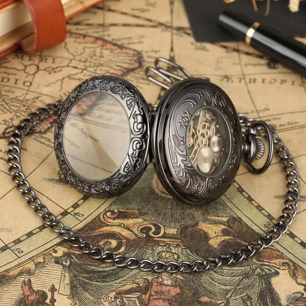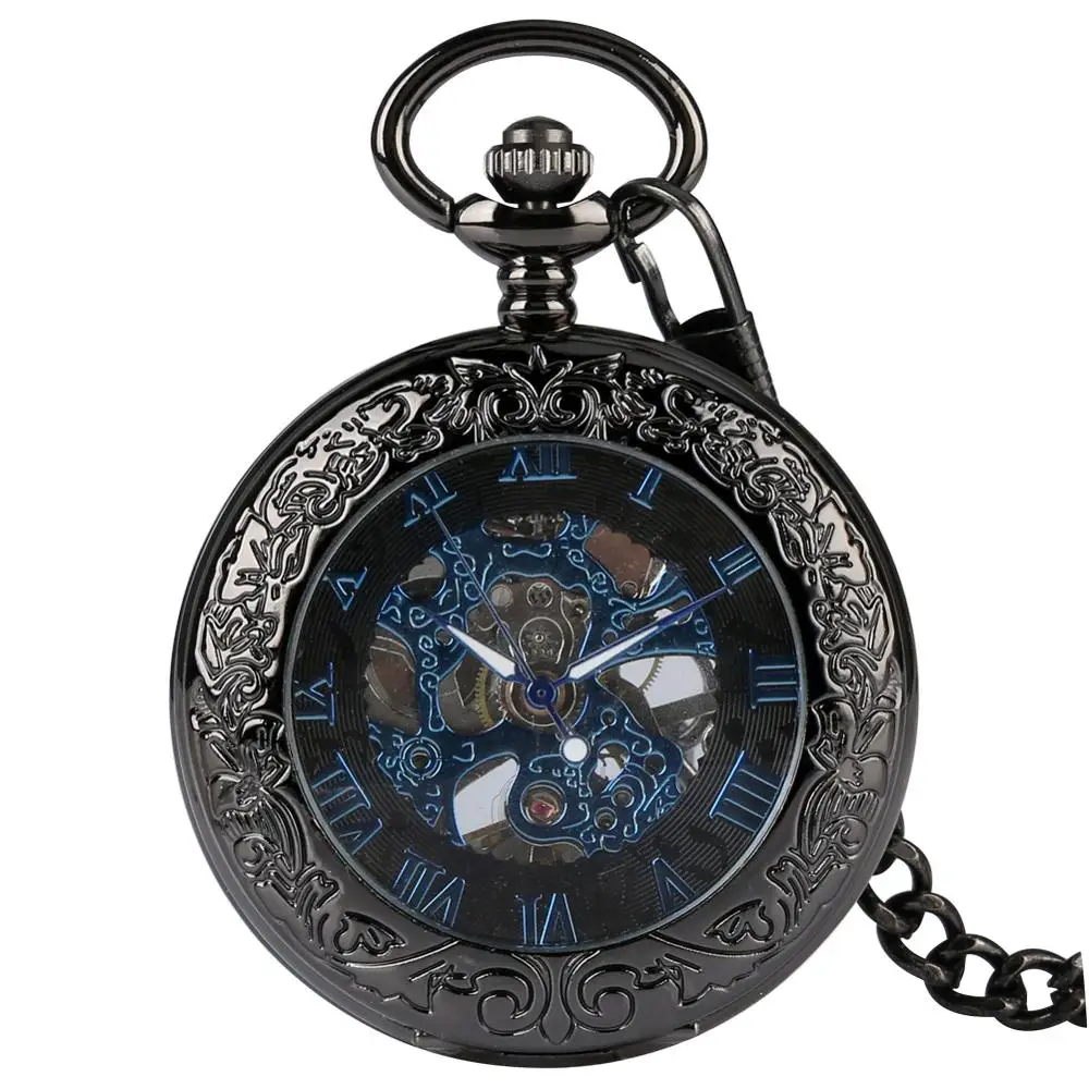 Новое поступление подвесные Часы шикарные синие римские цифры прозрачные механические ручной Ветер карманные часы античный брелок время для мужчин женщин