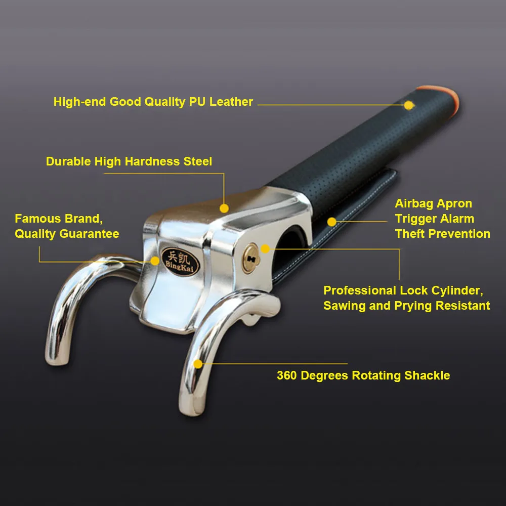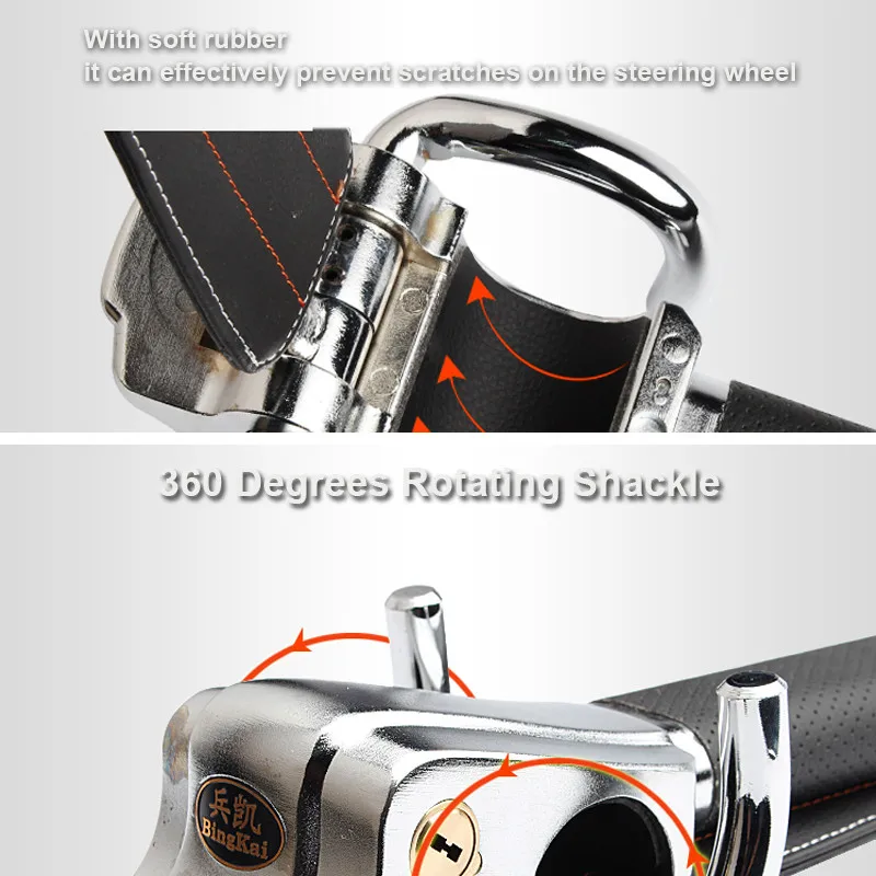 Особенности:Регулируемый Фартук для подушки безопасности, который больше подходит для использования. (Отрегулируйте его с помощью шестигранной кнопки)Когда замок вырезается вором, фартук подушки безопасности будет нажимать на автомобильный рожок, чтобы сделать предупреждение.Вилка замка может вращаться на 360 градусов, подходит для большинства рулей с толстой крышкой.Ручка замка покрыта высококачественной искусственной кожей с мужским шитьем, высококачественным внешним видом и долговечным в жаркое лето.На контактных зонах есть Противоизносная подушка, чтобы защитить ваш руль от любых повреждений.Его можно сложить и поместить под сиденье водителя, когда он не используется.Характеристики:Название продукта: складной замок на рулевое колесо безопасности, противоугонное устройство для автомобиля, очень безопасное трехнаправленное устройство с молотком БезопасностиМатериал: высокое качество из искусственной кожи и стали